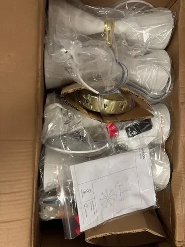 Люстра поставляется в разобранном виде. Коробка вполне удобна для переноски. Качество люстры отличное: толстый металл арматуры, хорошая покраска и полировка. Каждый из девяти плафонов вращается вокруг своей оси и может изменять наклон. В сборе люстра выглядит стильно и красиво.