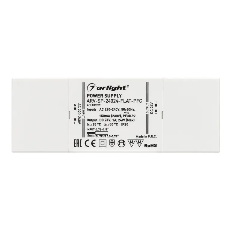 Блок питания ARV-SP-24024-FLAT-PFC (24V, 1A, 24W) (Arlight, IP20 Пластик, 5 лет)