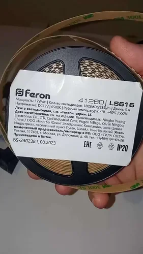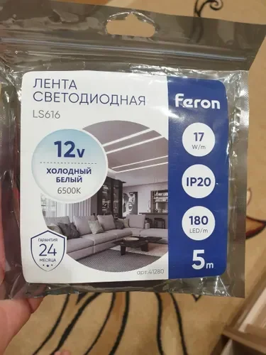 Светодиодная лента LS616 на базе светодиодов 2835 предназначена для внутреннего освещения и подсветки. Лента работает от напряжения 12 В, потребляет 17 Вт на метр и обеспечивает световой поток 1700 люмен на 5-метровой катушке. Холодный свет 6500 К с индексом цветопередачи CRI 80 подходит для функционального освещения.