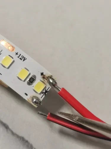 Лента режется по линиям через каждые 17 мм. После реза можно припаять провода к контактным площадкам для подключения отрезка к источнику питания.