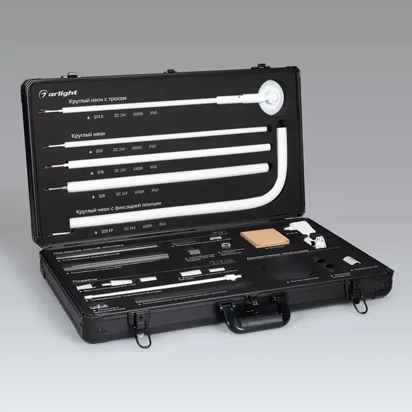 Демо-кейс для демонстрации различных вариаций круглого неона MOONLIGHT c возможностью подключения герметичных лент к сети. В комплекте демо-кейс, пять образцов неона (D13, D13 с тросом, D18, D25 и D25 с фиксацией позиции), блок питания на 230В, аксессуары для круглого неона. Материал: Металл, пластик, вспененный полиуретан. Размеры: 691×378×125 мм.