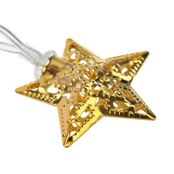 Светодиодная гирлянда «Звезды» питается от солнечной батареи. На проводе, помещенном в прозрачную изоляцию из ПВХ, находятся 12 диодов, которые выполнены в виде ажурных звезд золотистого цвета с глянцевым покрытием. Экономичные безопасные диоды излучают белый свет теплого оттенка. На питающем элементе предусмотрен блок управления с клавишей включения, выключения и смены режима на динамичный — удобное решение, когда гирлянда не используется. Защита IP44 допускает использование на улице.
