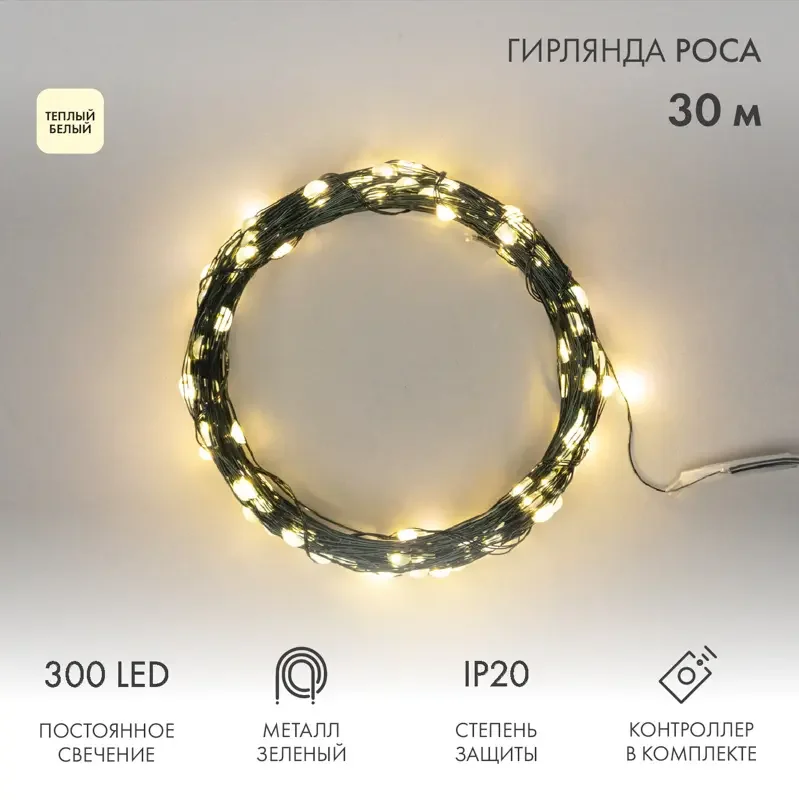 Гирлянда светодиодная Роса с контроллером 30м, 300LED, ТЕПЛЫЙ БЕЛЫЙ, IP20, 230В, зеленый провод NEON-NIGHT