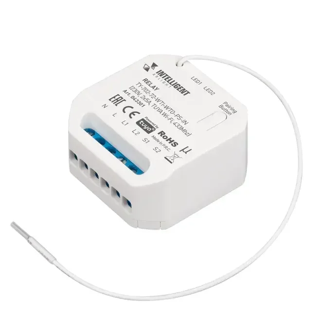 INTELLIGENT ARLIGHT Релейный модуль TY-702-72-WTI-WTO-PS-IN (230V, 2x5A, TUYA Wi-Fi, 433Mhz) (IARL, IP20 Пластик, 3 года)