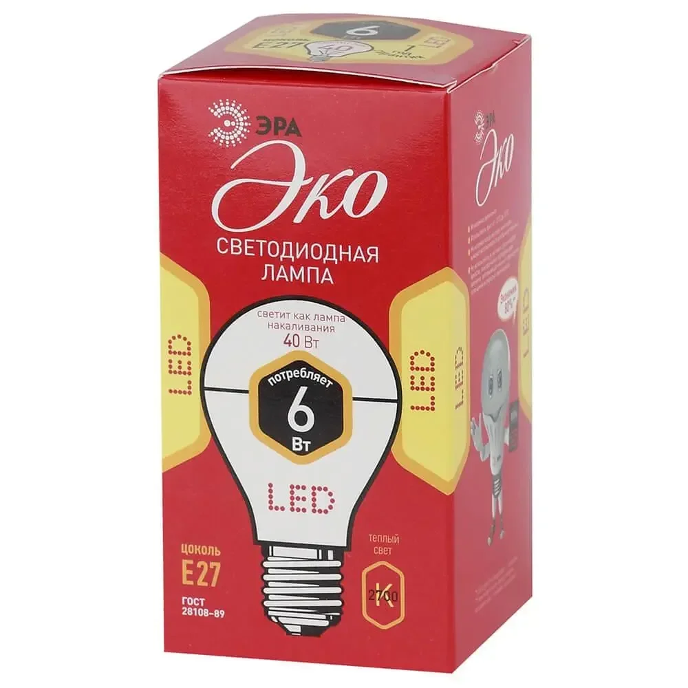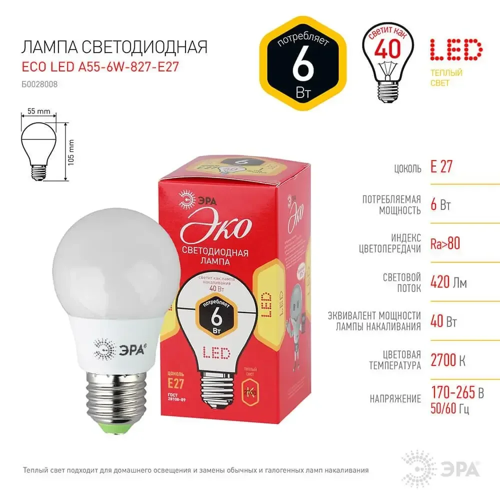 Лампа светодиодная E27 6W 2700K матовая ECO LED A55-6W-827-E27 Б0028008