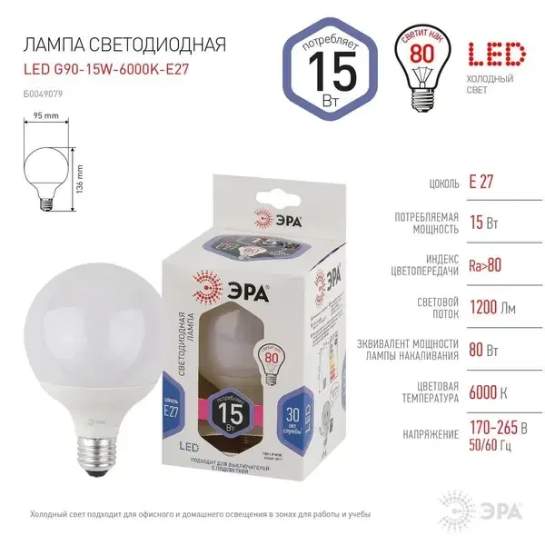 Лампа светодиодная ЭРА E27 15W 6000K матовая LED G90-15W-6000K-E27 Б0049079