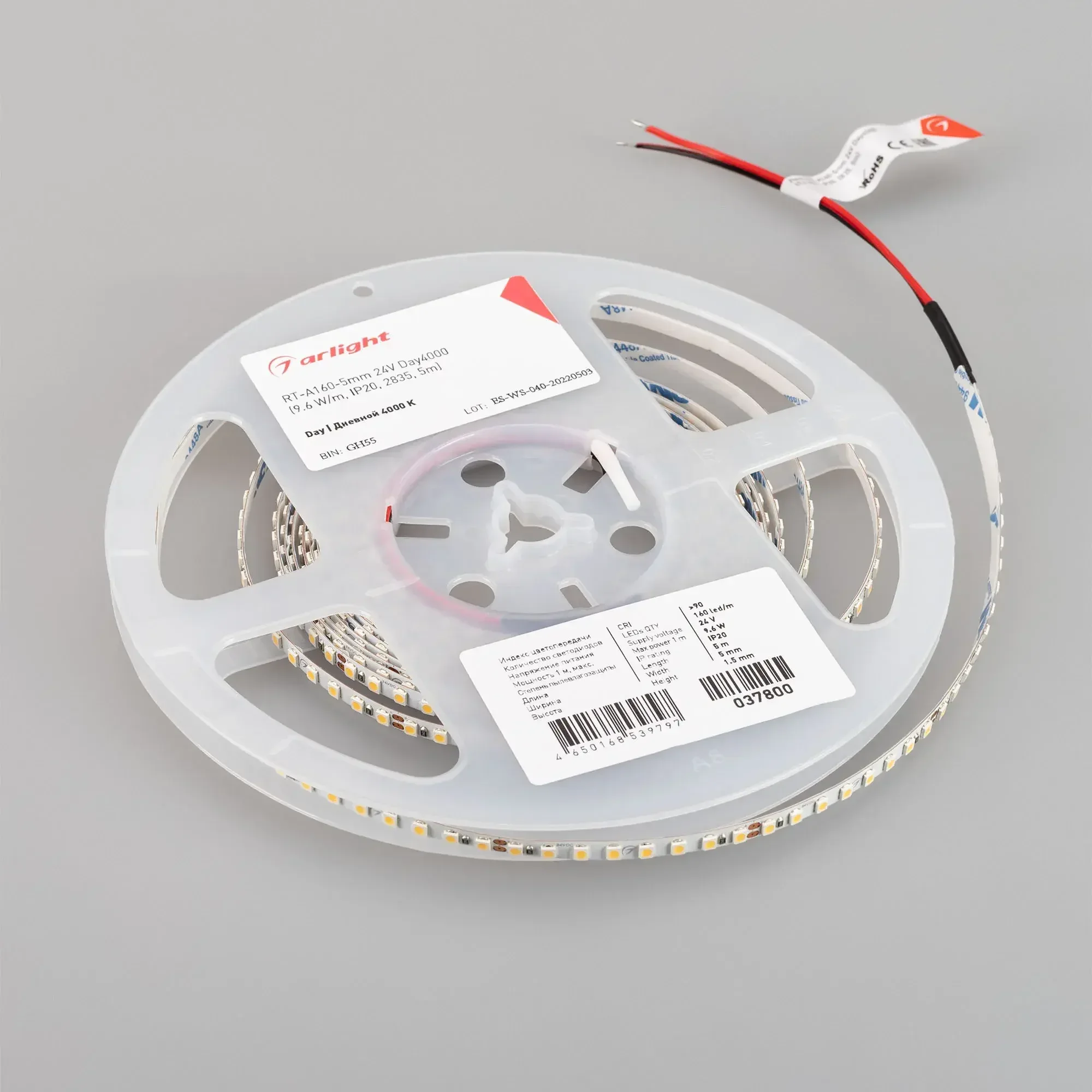 Лента RT-A160-5mm 24V Day4000 (9.6 W/m, IP20, 2835, 5m) (Arlight, Открытый)
