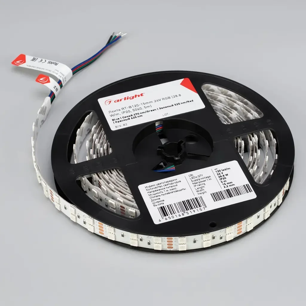 Лента RT-B120-15mm 24V RGB (28.8 W/m, IP20, 5060, 5m) (Arlight, Открытый)