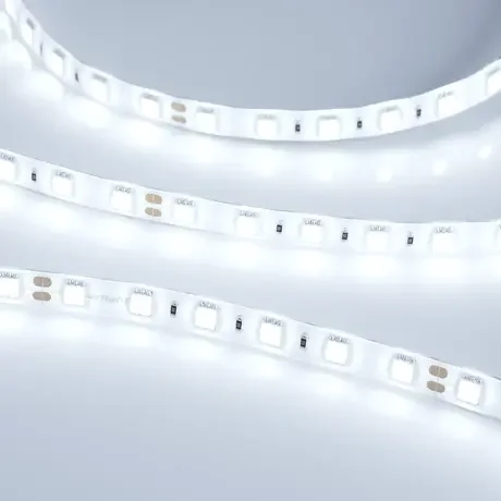 Светодиодная лента 24 В с холодным белым светом (12000 К) и степенью защиты IP65. Лента содержит 300 светодиодов 5060 размером с плотностью 60 шт/м, обеспечивая световой поток 1300 люмен. Мощность 14,4 Вт/м требует алюминиевого профиля для отвода тепла. Поддерживает диммирование через PWM-управление.