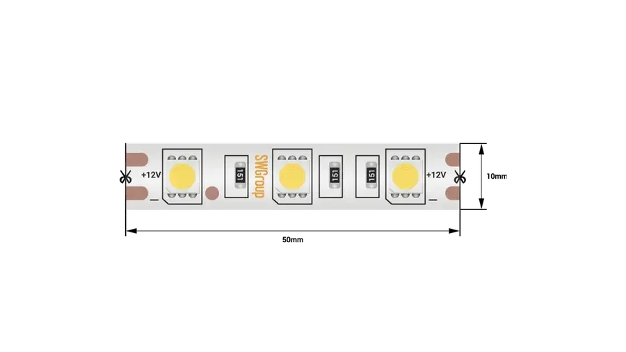 Лента со скотчем 3М светодиодная стандарт 5050, 60 LED/м, 14,4 Вт/м, 12В , IP68, Цвет: Теплый белый