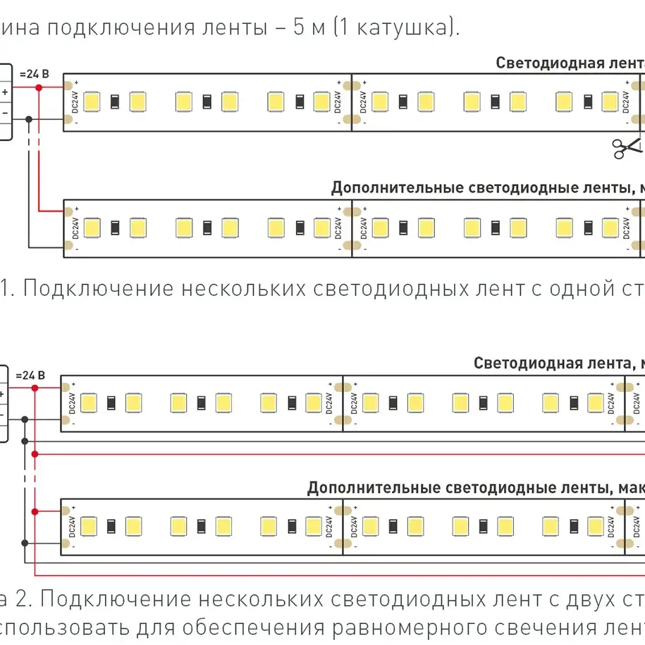 - Модели с напряжением 24 вольта обладают большей надежностью, яркостью и удобством подключения при использовании диммеров и контроллеров.
