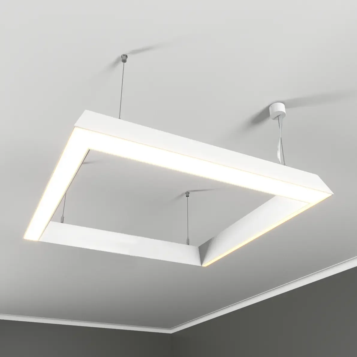 Профильные подвесные светодиодные светильники в форме Квадрата со свечением наружу под углом 30° выполняют двойную функцию: освещают помещение, а также служат оригинальным, декоративным элементом в современном стиле.
