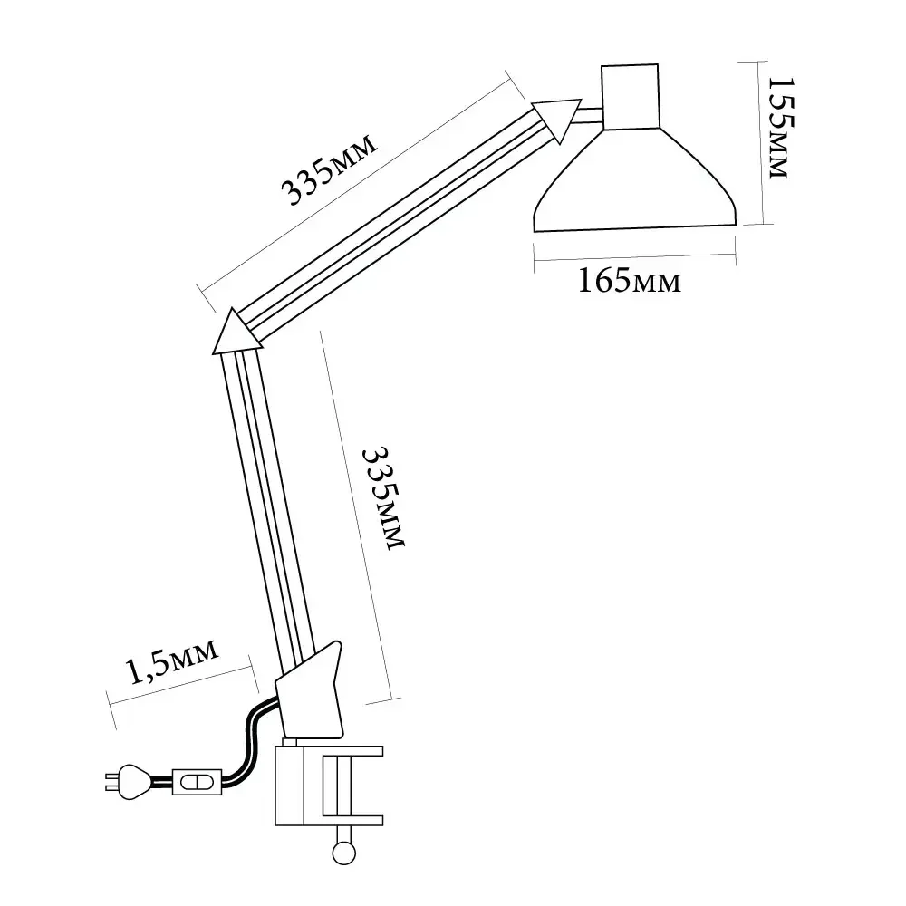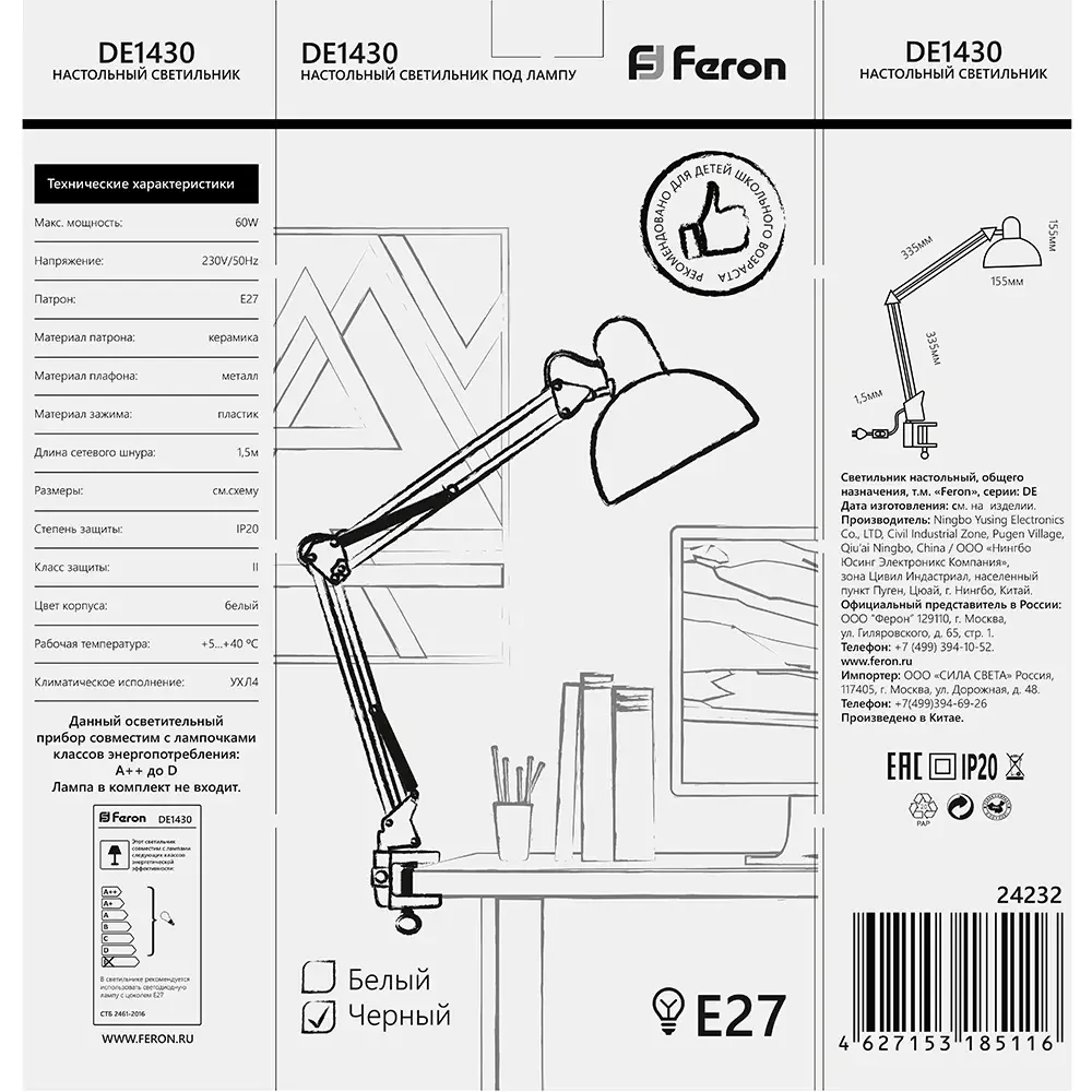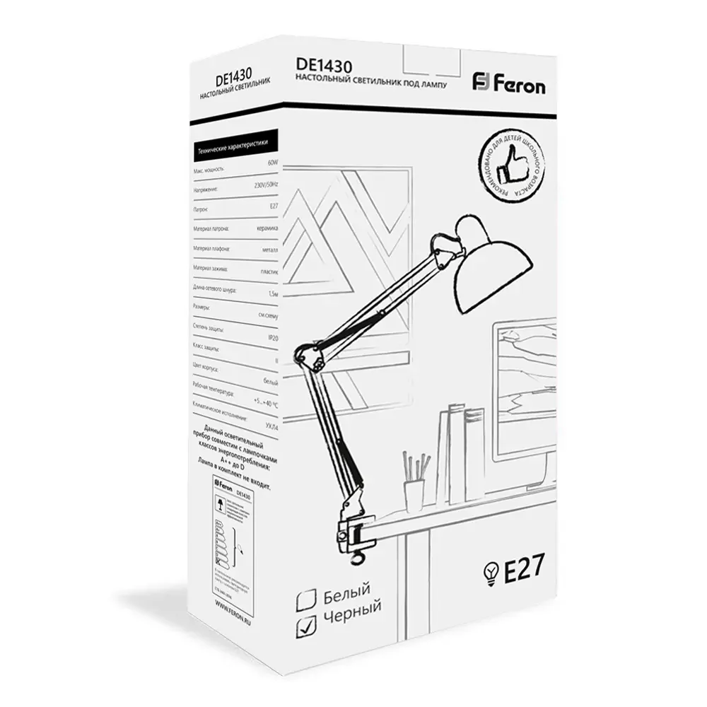 Светильник настольный под лампу E27, max 60W, 230V на струбцине, черный, DE1430