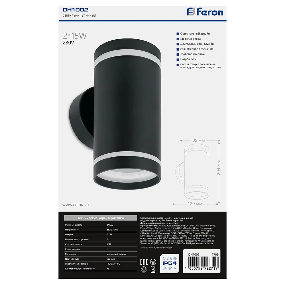 Светильник садово-парковый, 230V 2*GX53, DH1002, черный (на стену вверх/вниз)