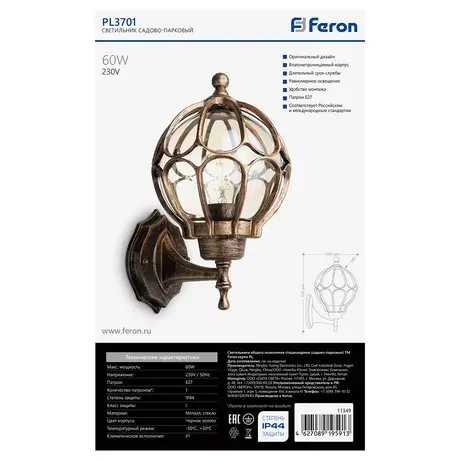 Светильник садово-парковый, 60W 230V E27 IP44 черное золото, PL3701