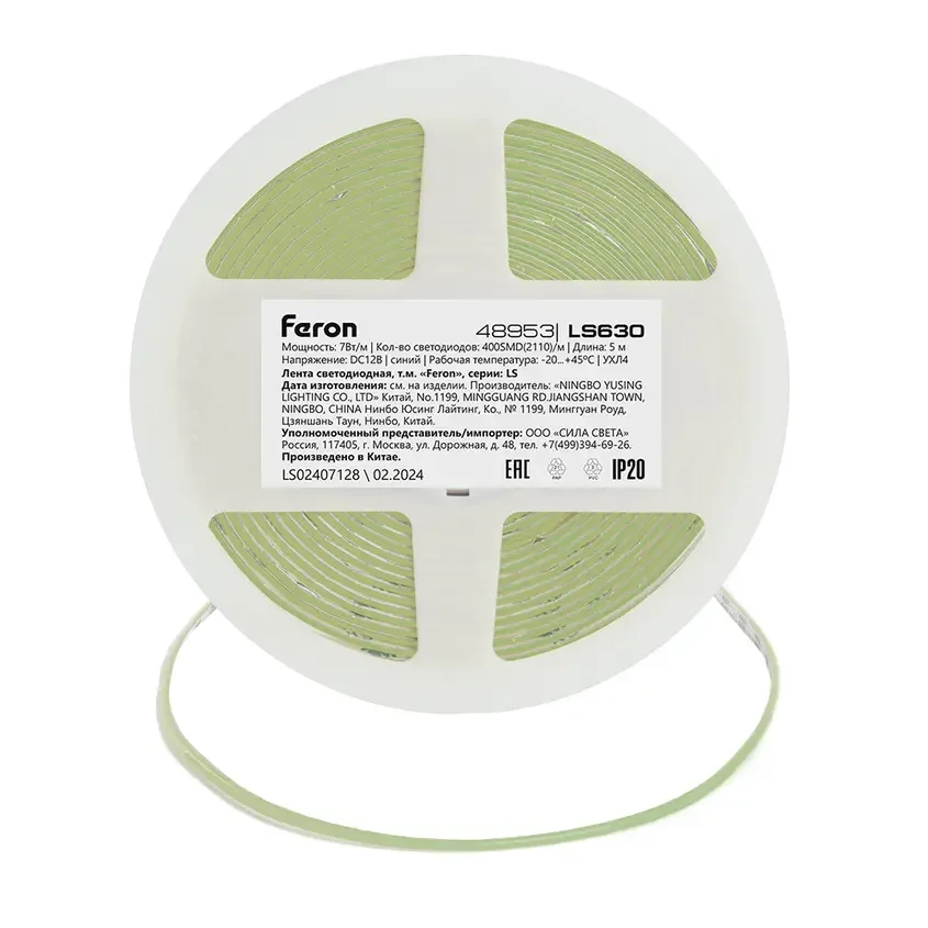 Светодиодная COB лента Feron LS630, 400SMD(2110)/ 7Вт/м 12V 5000*3*1.8мм синий, IP20, 48953