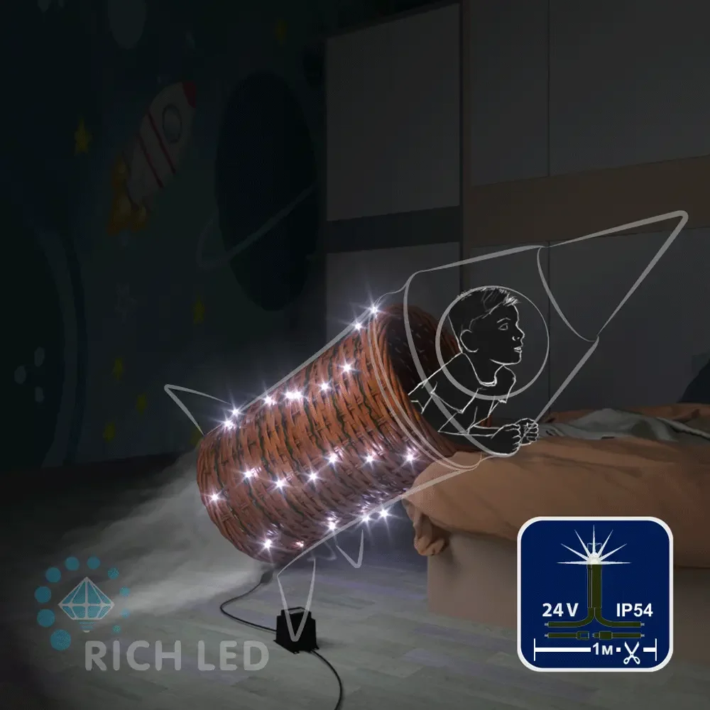 Светодиодная гирлянда Rich LED 100 м в бобине, 500 LED, 24 В, белая, полный флэш, черн/зел провод, резка 5 LED, RL-S100FF-24V-BG/W
