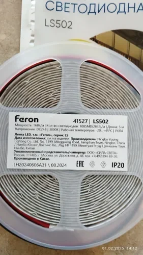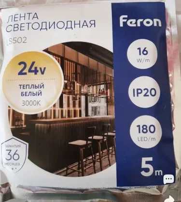 Светодиодная LED лента Feron LS502, 180SMD(2835)/м 16Вт/м 24V 5000*10*1.22мм 3000К