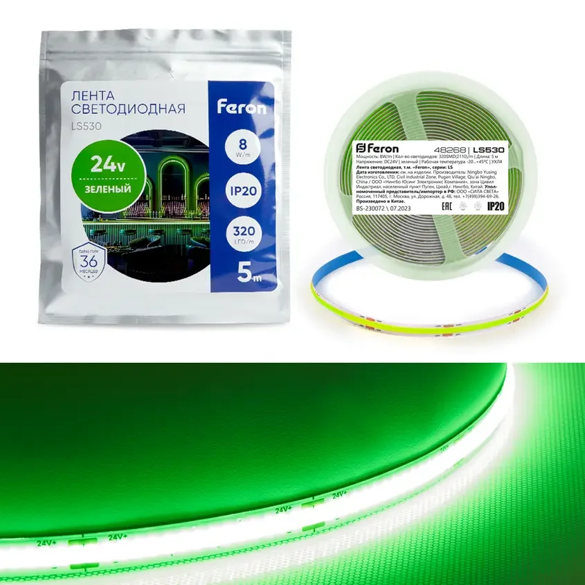 Светодиодная LED лента Feron LS530 320SMD(2110) 10Вт/м 24V 5000*8*1.8мм IP20, зеленый
