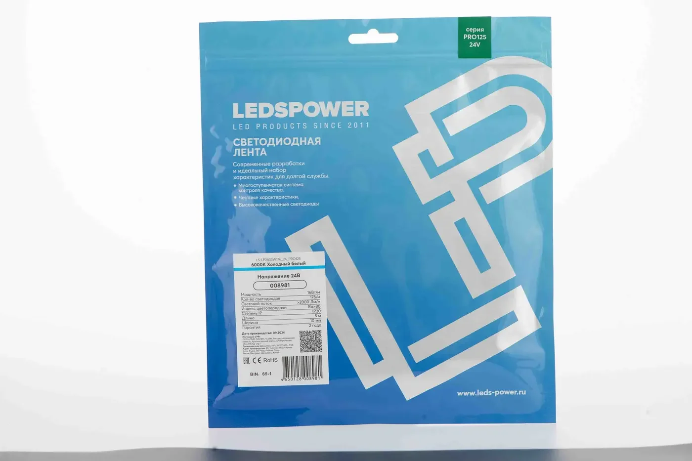 Светодиодная лента 2835 176/м (16Вт/м) 24В холодная, серия ПРО125 008981