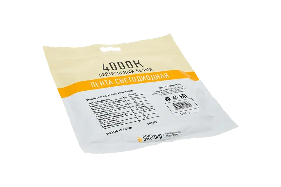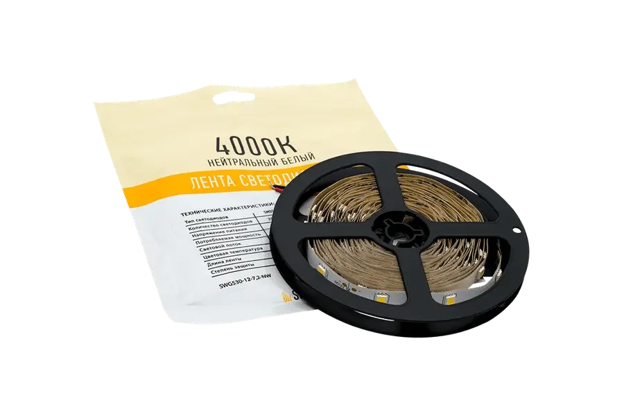 Светодиодная лента SWG Standard серии SWG530 на светодиодах SMD5050 предназначена для декоративной и функциональной подсветки в сухих помещениях. Нейтральный белый свет 4000–4500 К подходит для кухонь, рабочих зон, витрин и ниш, где важна естественная передача оттенков.