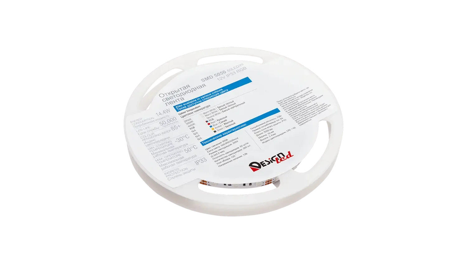 RGB-лента на светодиодах 5050 с плотностью 60 диодов на метр. Работает от напряжения 12 В постоянного тока. Мощность 14,4 Вт на 5 метров требует алюминиевого профиля для отвода тепла. Степень защиты IP33 предусмотрена для внутренних помещений с умеренной влажностью.