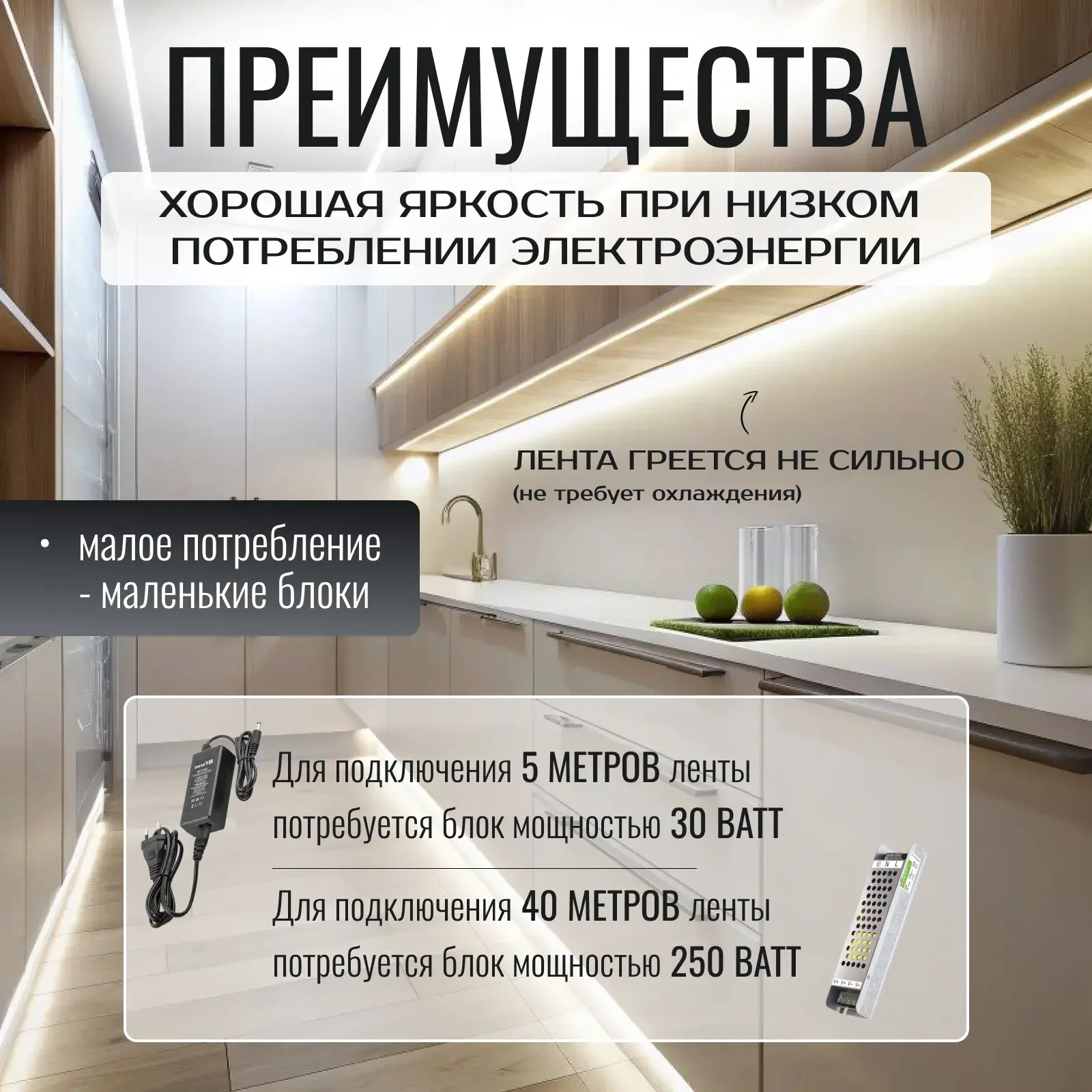 - Благодаря низкому потреблению электроэнергии для подключения ленты требуются небольшие по габаритам блоки питания. Лента не нагревается, использование профиля для охлаждения не обязательно.