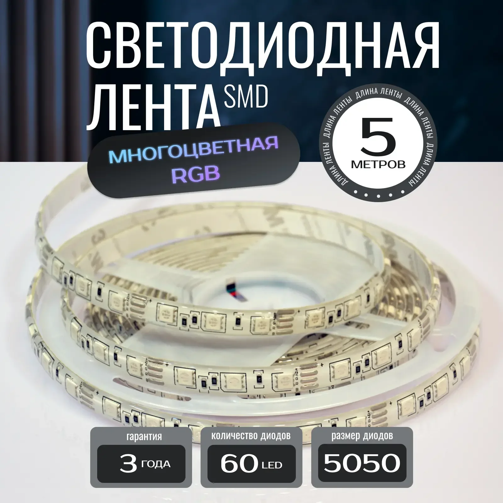 - Лента с трехкристальными светодиодами 5050, обеспечивающими высокую яркость и равномерное свечение.