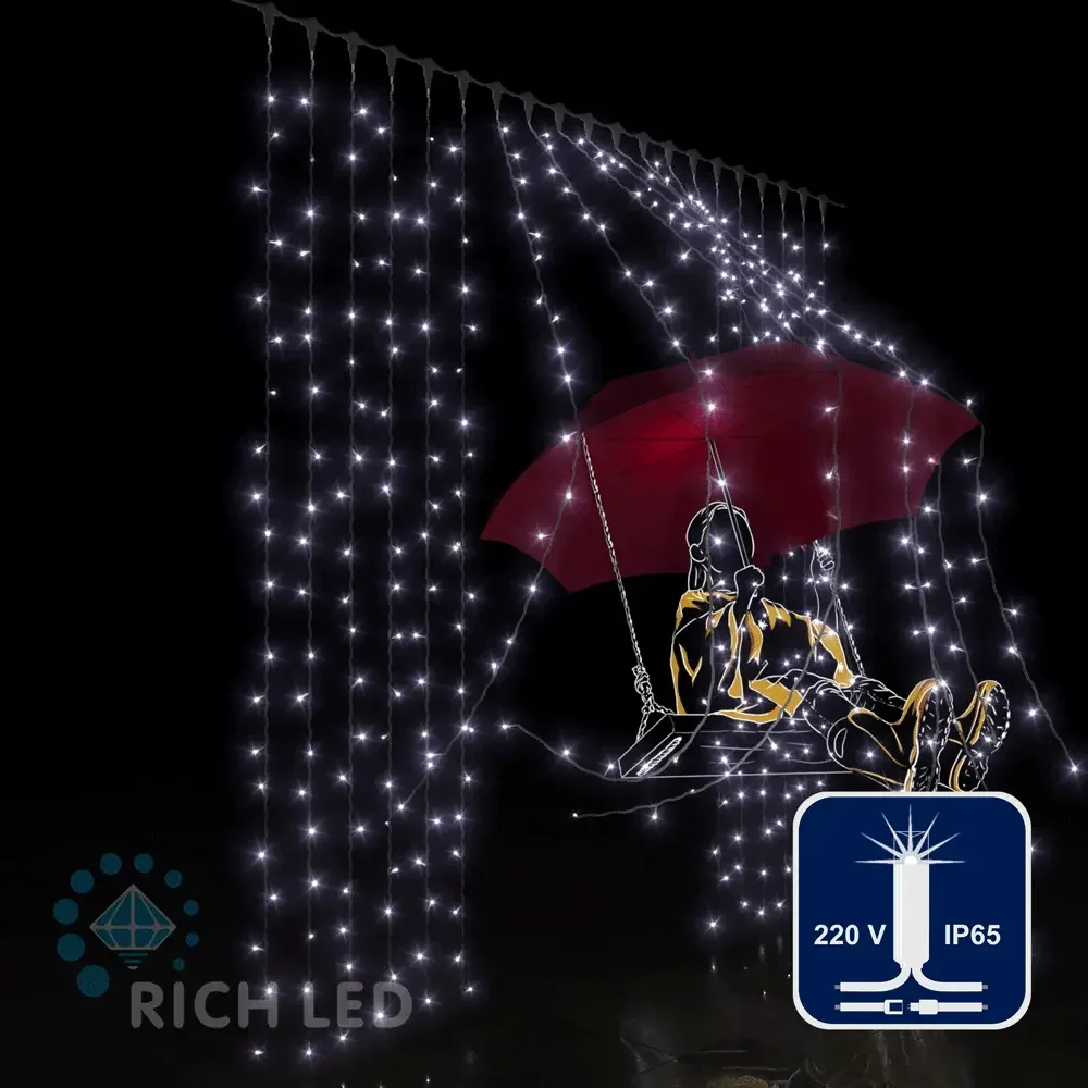 Светодиодный занавес (дождь) Rich LED 2*2 м, влагозащитный колпачок, мерцающий, белый, белый провод, RL-C2*2F-CW/W