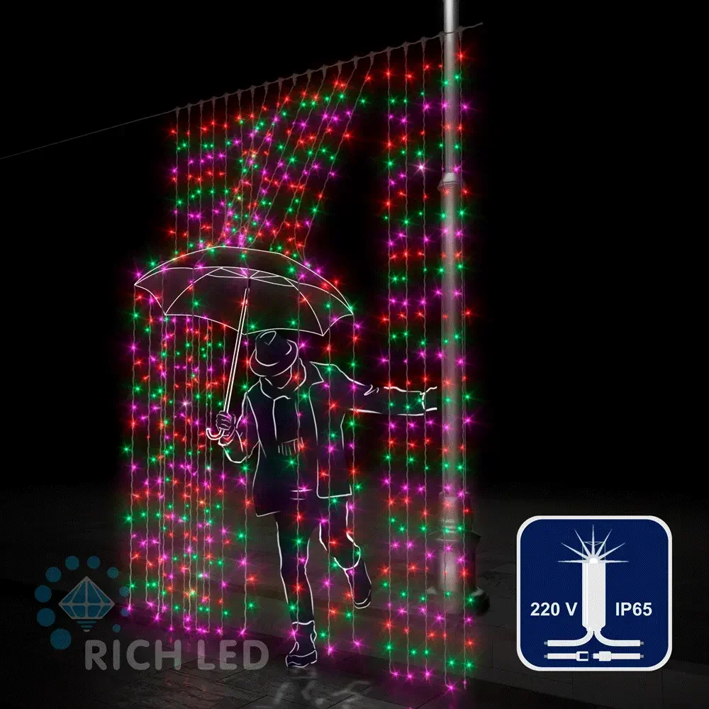 Светодиодный занавес (дождь) Rich LED 2*3 м, влагозащитный колпачок, мерцающий, мульти, белый провод, RL-C2*3F-CW/M