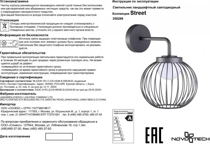 Уличный светодиодный настенный светильник Novotech Carrello 358286