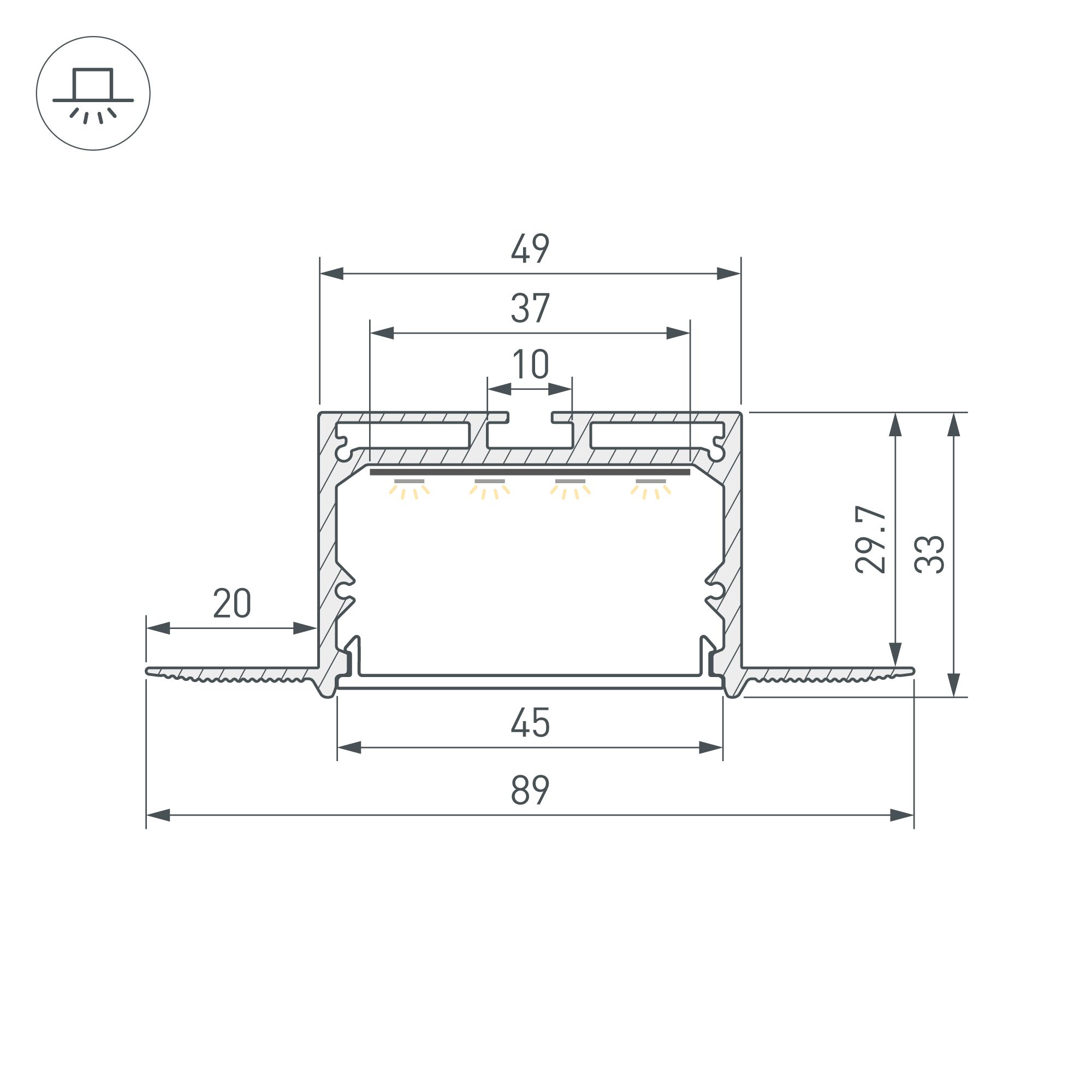 Алюминиевый анодированный профиль для светодиодных лент и линеек. Габаритные размеры (L×W×H): 2000x89x33 мм, паз для установки 49 мм. Ширина площадки для ленты 37 мм. Экраны, заглушки и другие аксессуары приобретаются отдельно. Цена за 1 метр.