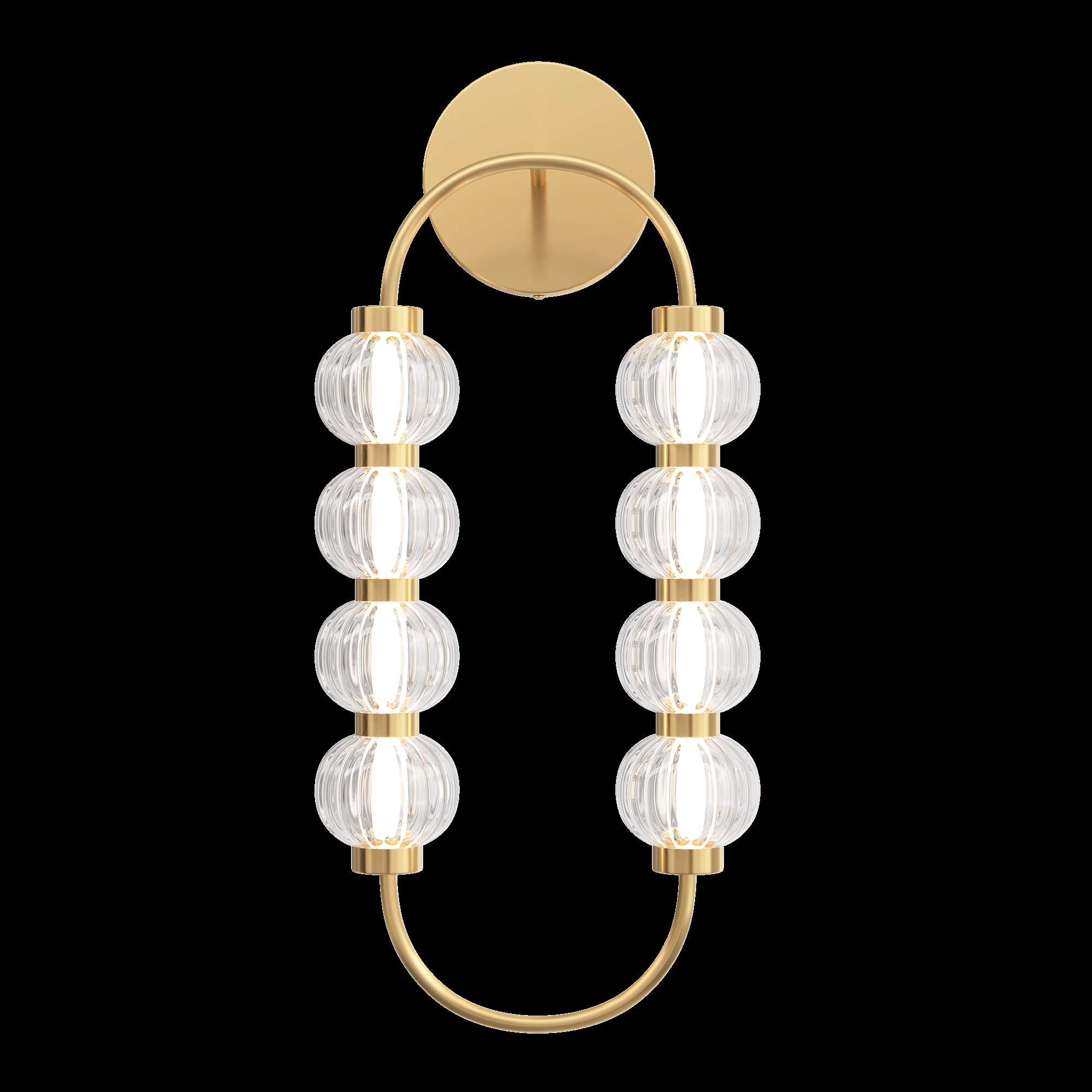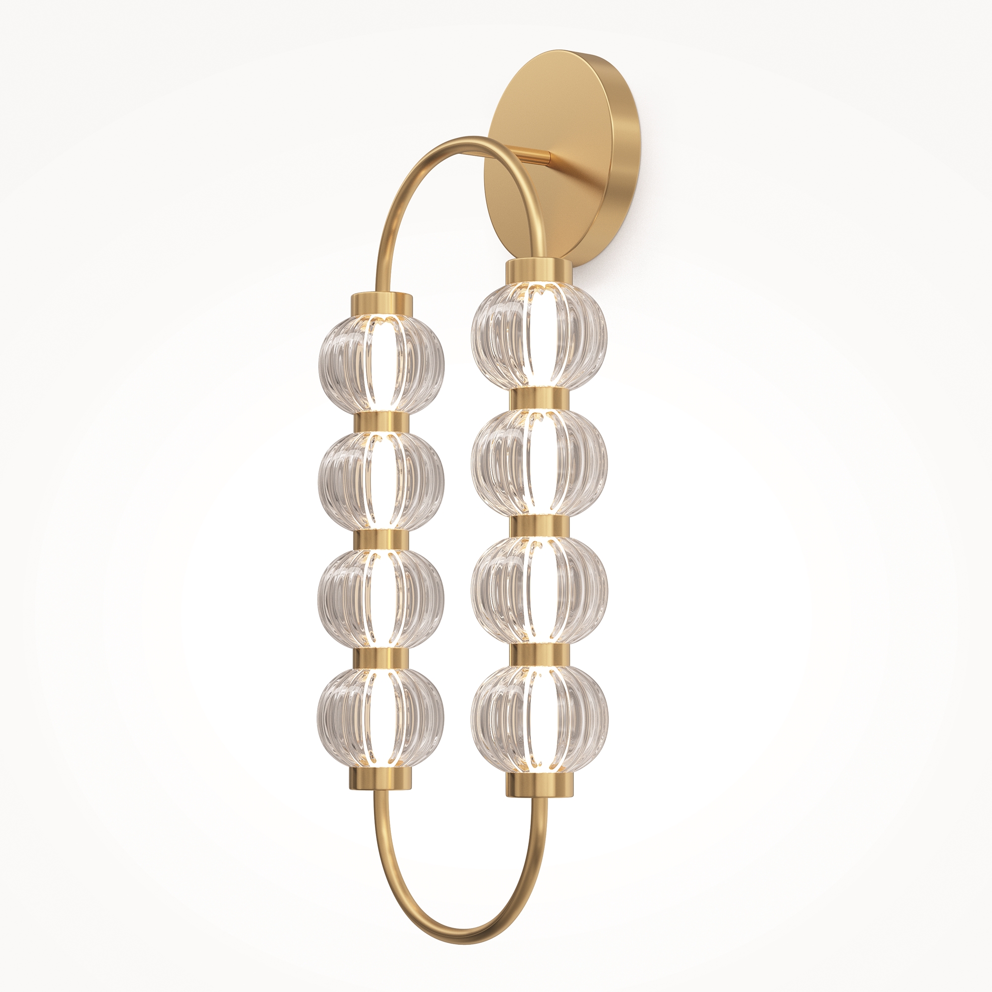 Арматура из металла, цвет – золото, хром. Акцентный декор в виде рельефных сфер из литого стекла. Источник света – светодиодная лента – скрыта под акриловым рассеивателем. Регулируемая высота подвесных светильников.