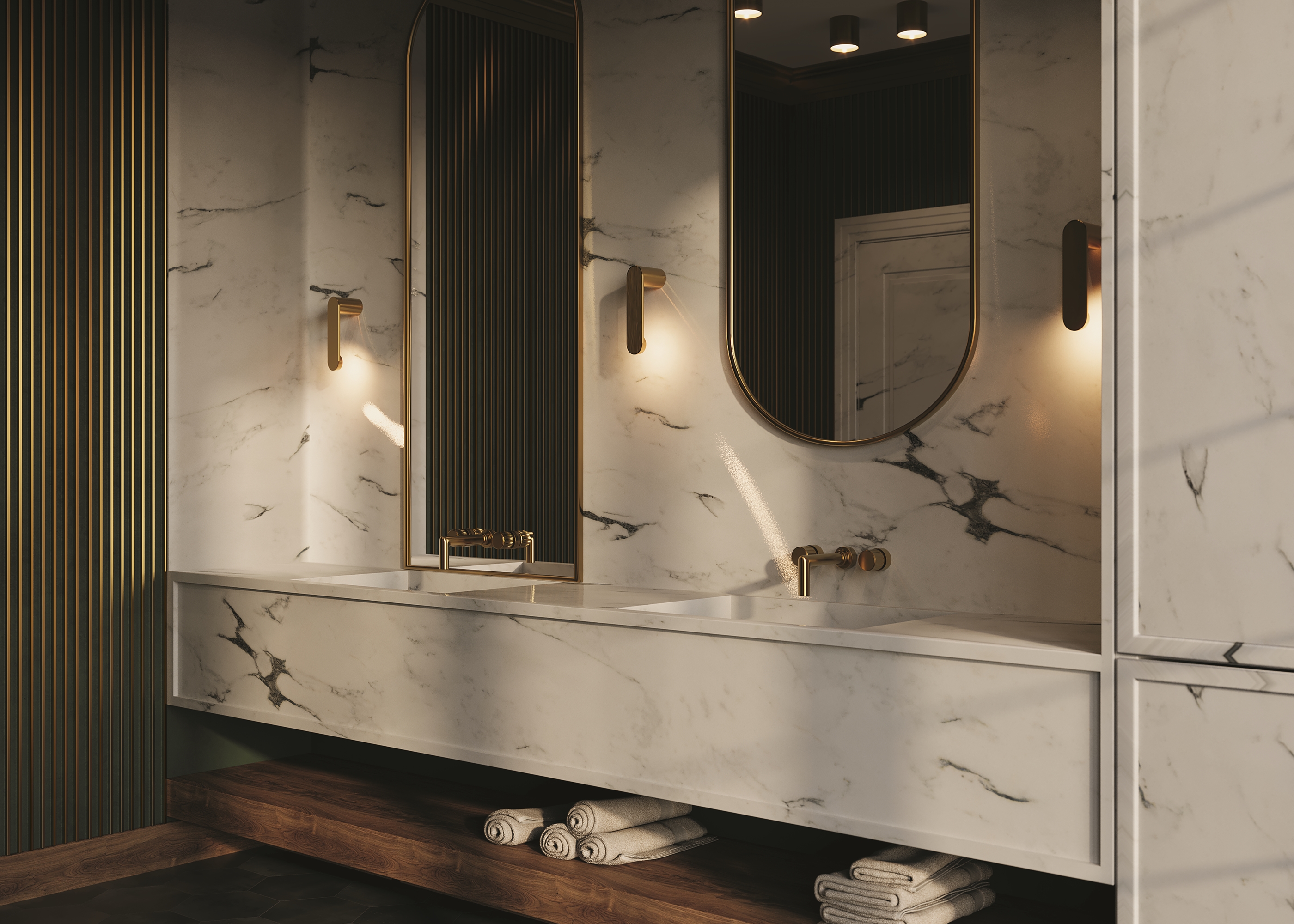 Металлический корпус в трех цветовых вариантах: черный, белый, латунь. Серия универсальна, светильники подойдут для большинства интерьеров. Источник света — LED. Цветовая температура – 3000 K. Тип рассеивания — переотраженный, угол рассеивания — 125°.