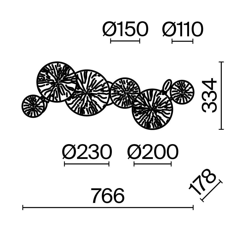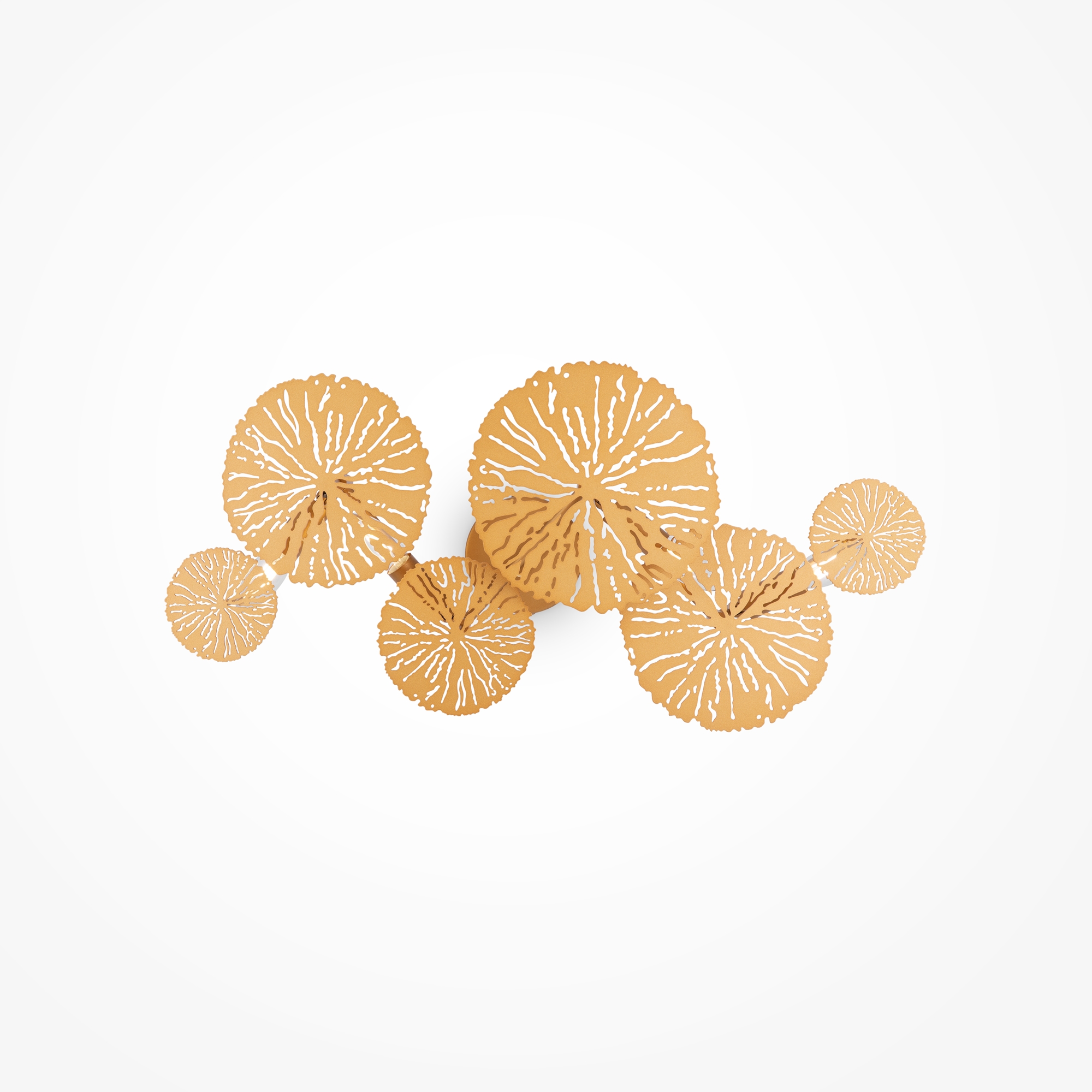 Арматура из металла, цвет — матовая латунь. Декор — ажурные диски в тон арматуре. Эффектный световой рисунок. Трендовые флористические мотивы в дизайне. Светильники серии легко комбинировать, создавая композиции. Источник света – лампа с цоколем Е14.