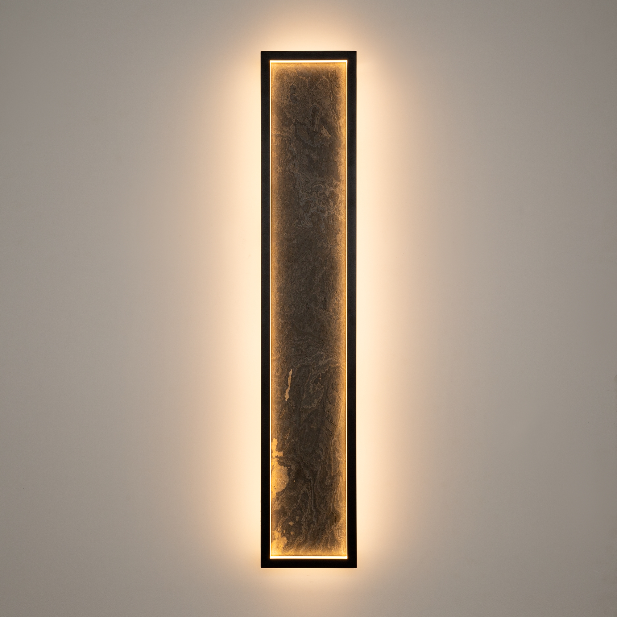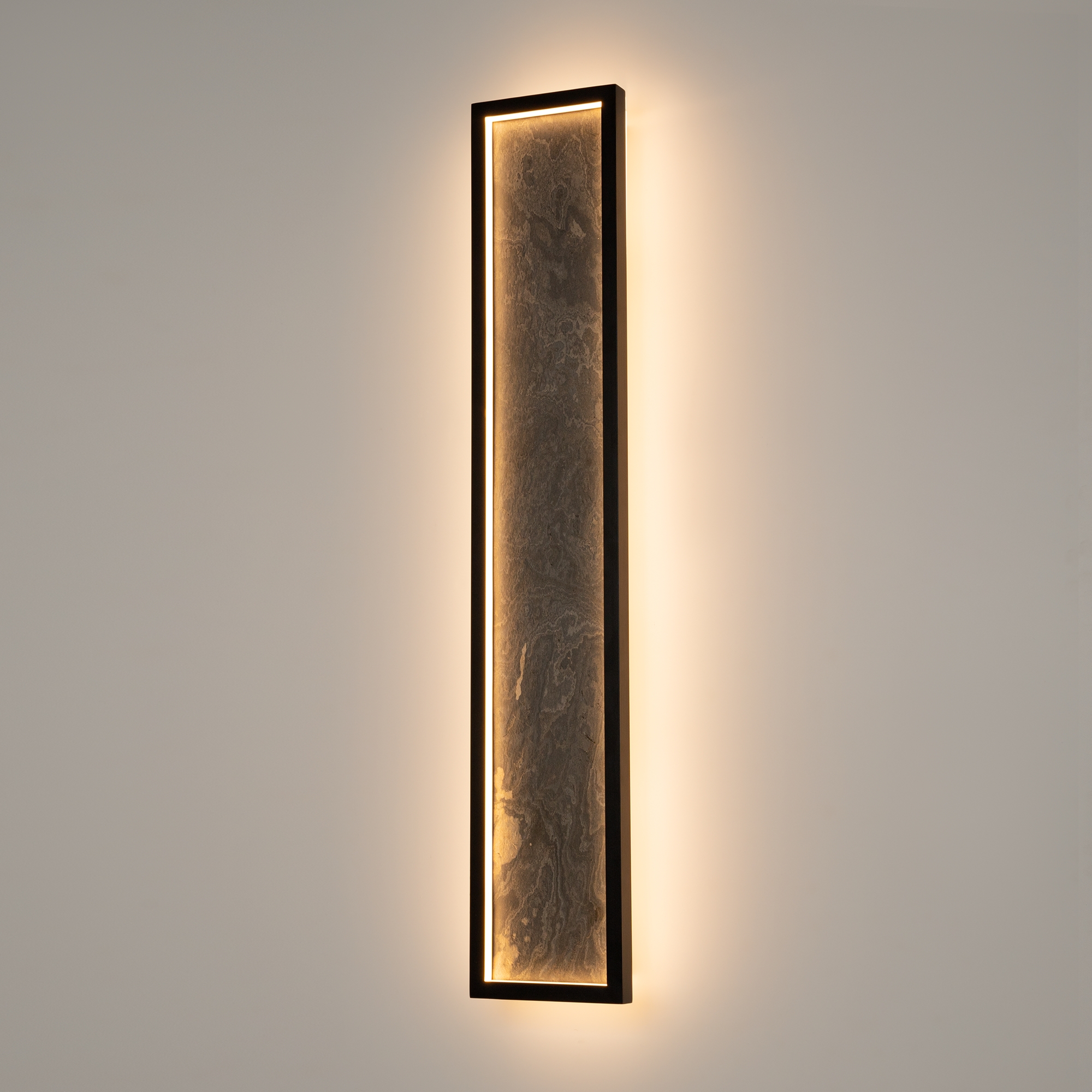 Сочетание первозданных материалов и современных технологий освещения. Корпус из натурального камня серого цвета с естественным рисунком и прожилками, подсвеченный LED-источником света с температурой 3000К. Цвет арматуры — черный. Материал арматуры — металл. Светодиодный источник света. Два размера потолочных и настенных моделей. Игра света и тени подчеркивает природный рельеф камня. Высокий индекс цветопередачи >90 Ra для естественного освещения.