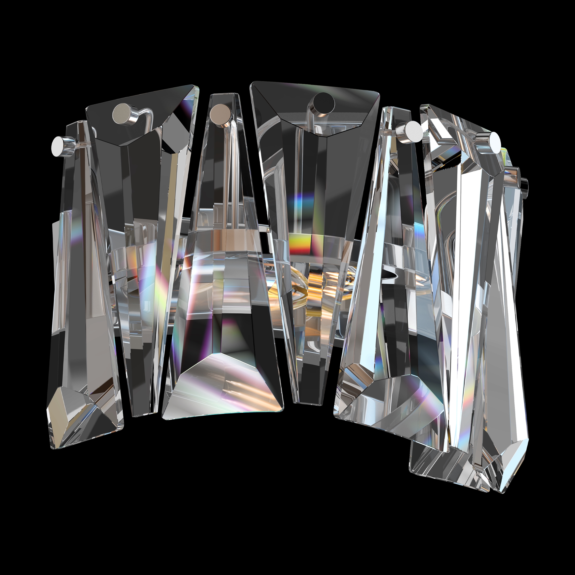 Материал арматуры – металл, оттенки – хром и золото. Декор – массивные кристаллы сложной огранки. Высота подвесных моделей регулируется длиной цепи.