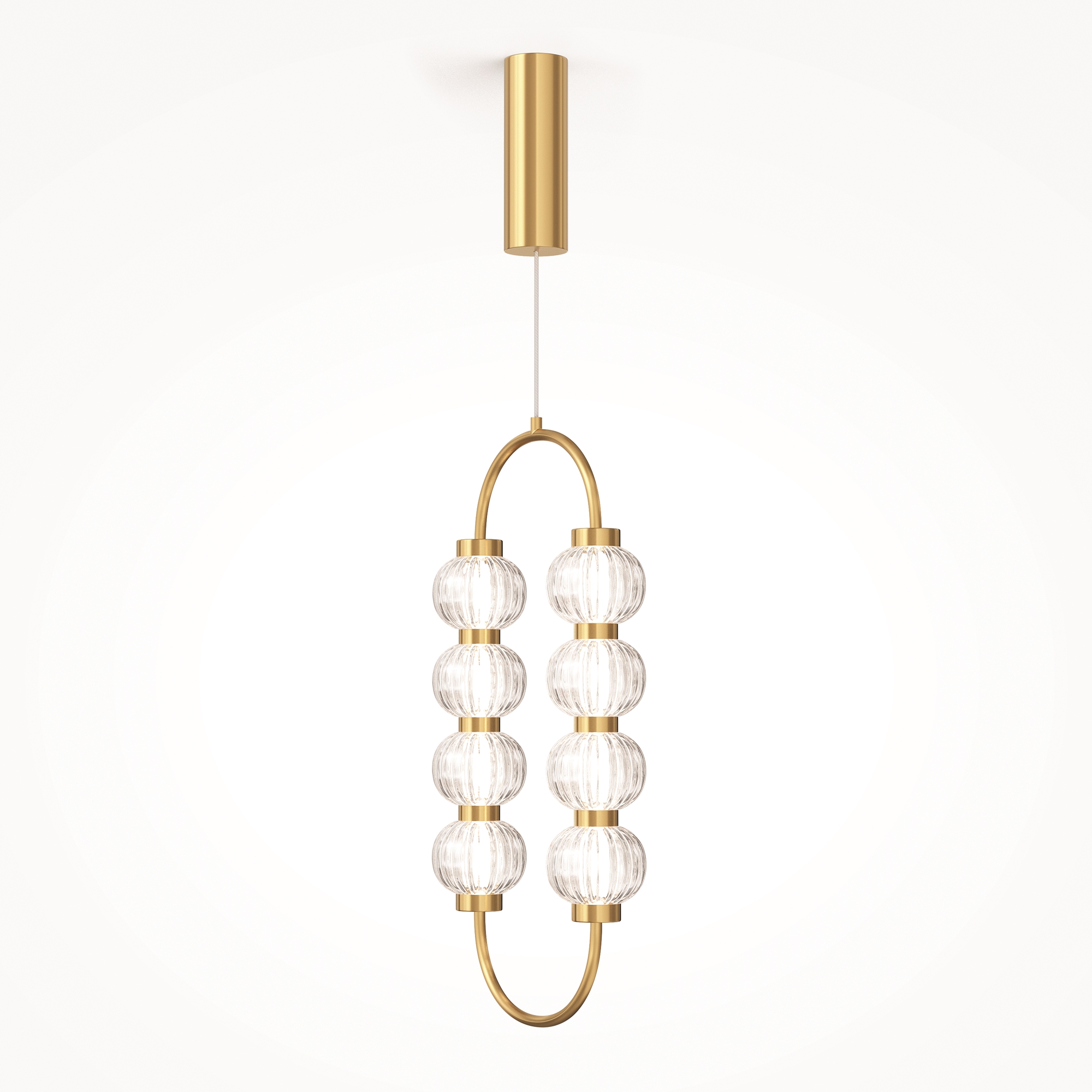 Арматура из металла, цвет – золото, хром. Акцентный декор в виде рельефных сфер из литого стекла. Источник света – светодиодная лента – скрыта под акриловым рассеивателем. Регулируемая высота подвесных светильников.