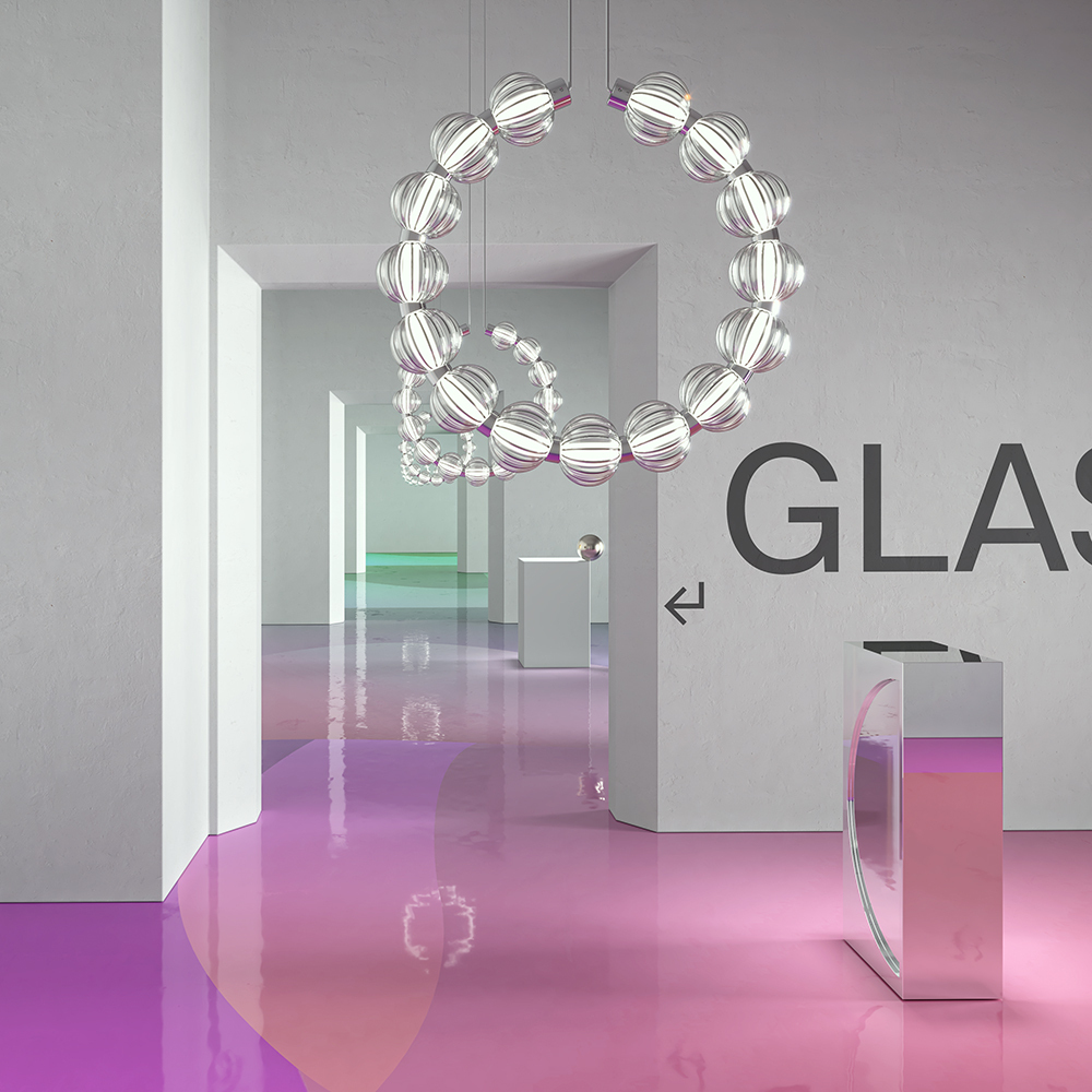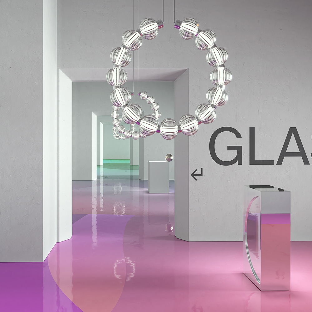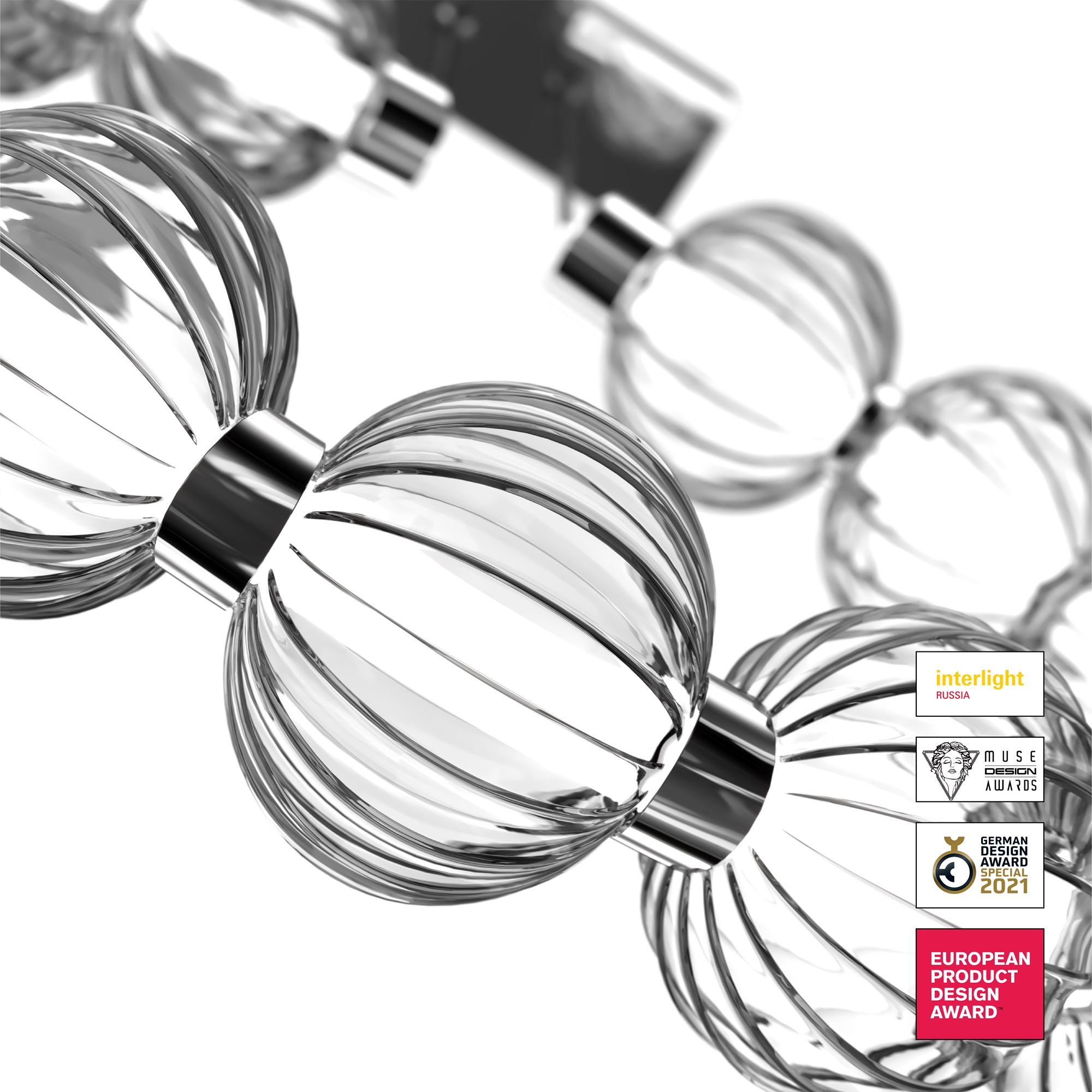 Арматура из металла, цвет – золото, хром. Акцентный декор в виде рельефных сфер из литого стекла. Источник света – светодиодная лента – скрыта под акриловым рассеивателем. Регулируемая высота подвесных светильников.
