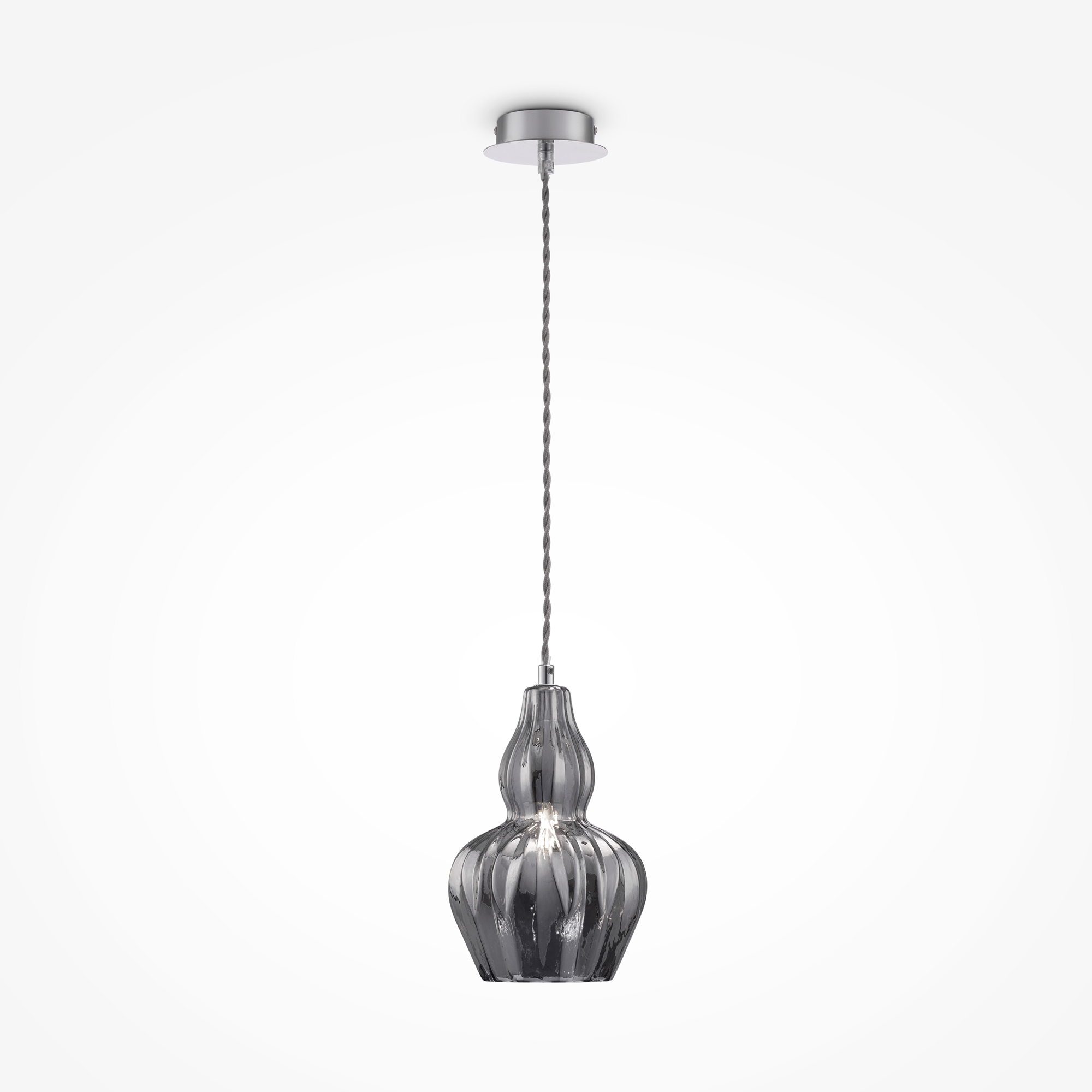 Арматура – металл, оттенок – никель. Рельефный плафон выполнен из стекла. Оттенки плафона: прозрачный, зеркальный, зеленый, голубой. Витой провод. Регулируемая высота.