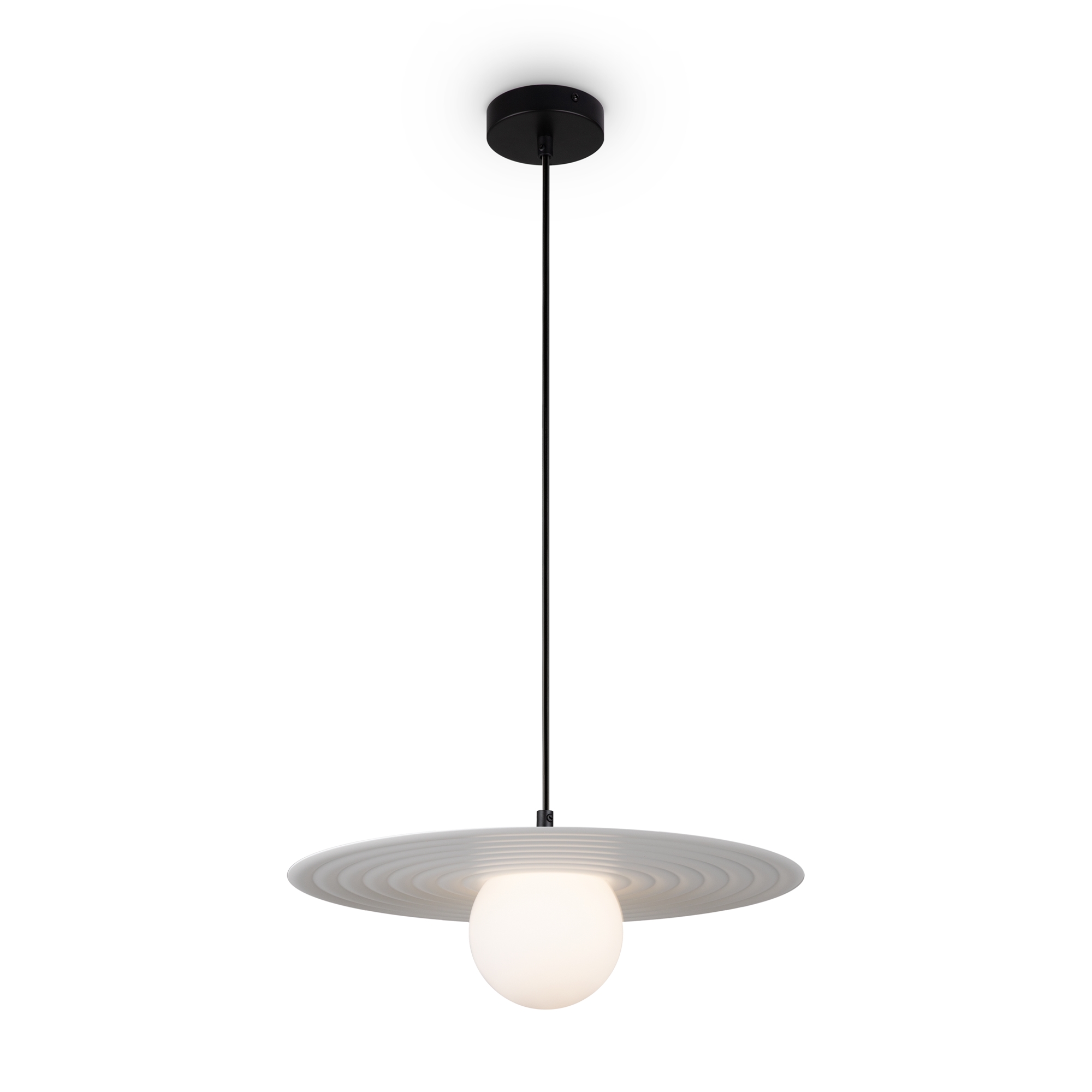 Арматура — металл, цвета — чёрный и белый. Матовый белый плафон с декоративным элементом — металлической тарелкой. Можно регулировать минимальную и максимальную высоту. Лампа с цоколем G9 служит источником света.