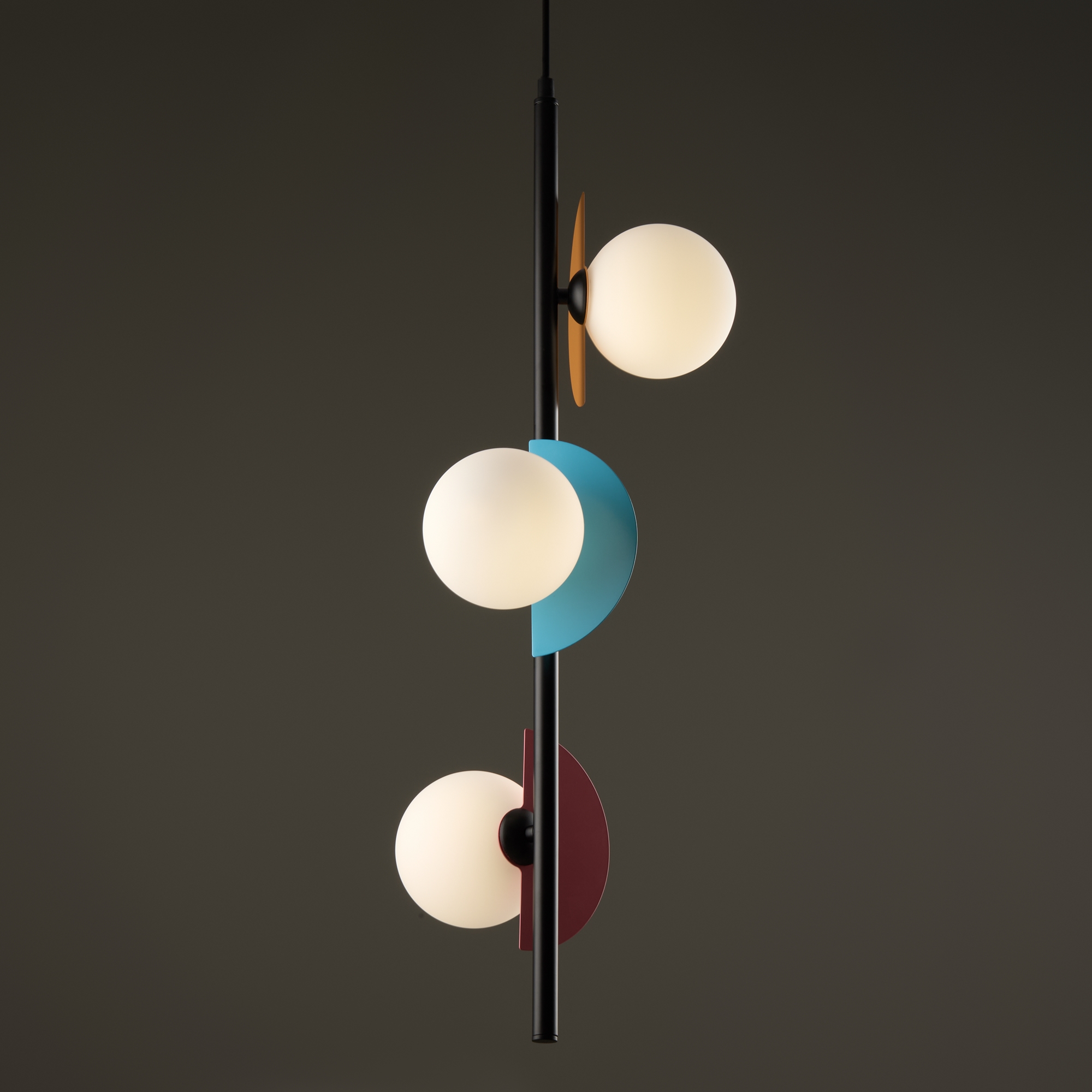 Арматура — металл, цвет — разноцветный или латунь. Белые матовые плафоны из стекла украшены металлическими золотыми или цветными лепестками. Динамичный дизайн для интерьеров в стиле Мемфис. Разнообразие форм в одной конструкции позволяет создать яркое освещение в больших комнатах. Высота регулируется. Источником света служит лампа с цоколем G9.