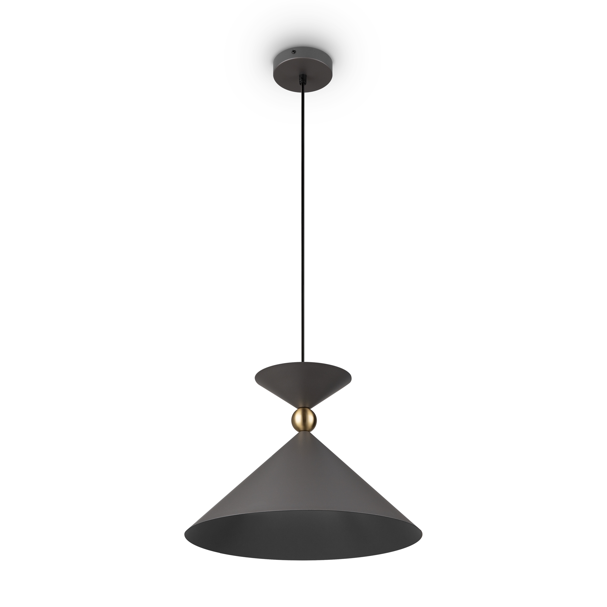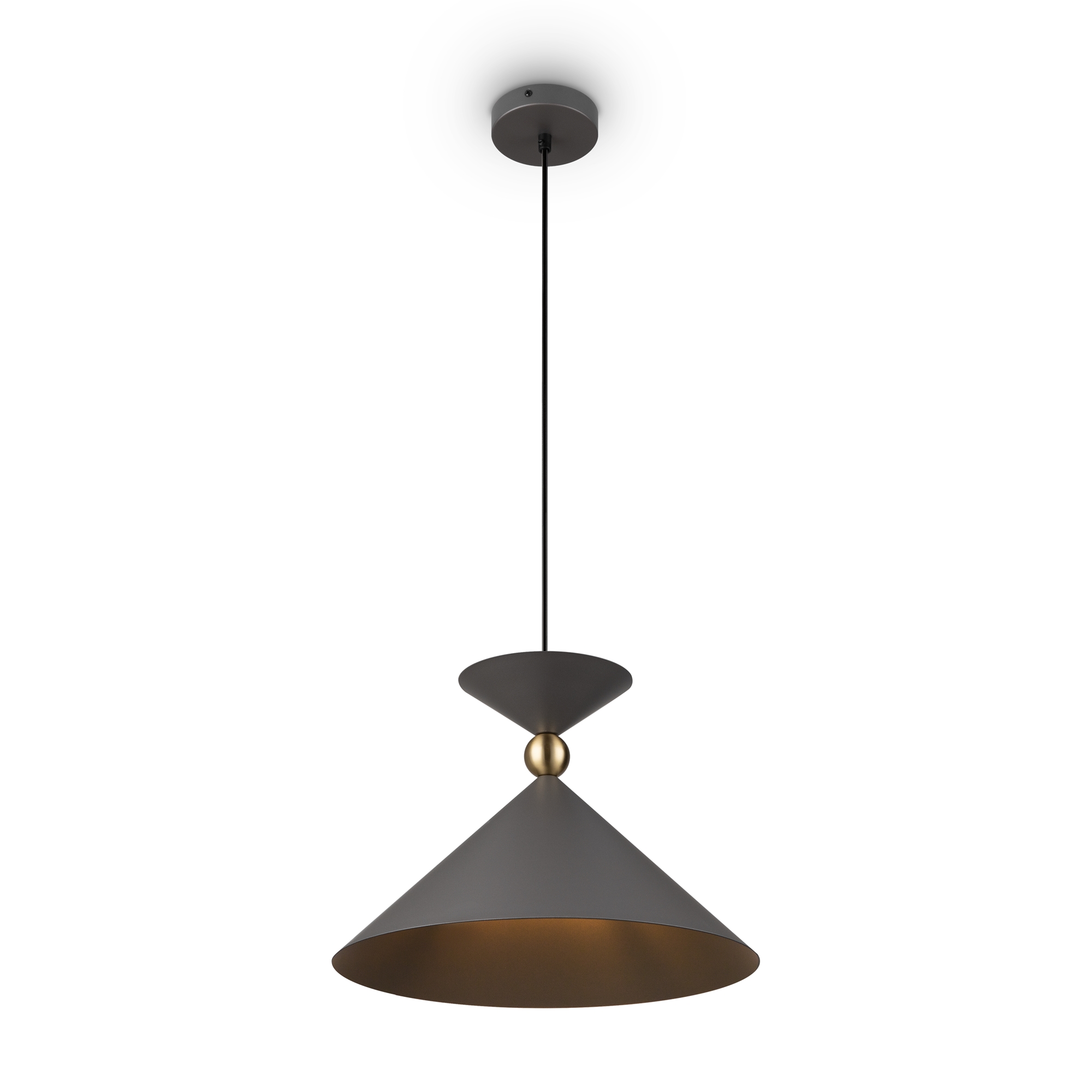 Арматура и плафоны из металла в двух цветах — белом и сером. Плафон состоит из 2-х конусов разных размеров, соединённых золотистым декоративным элементом. Высота регулируется. Идеальны для составления композиций. Источник света — лампа с цоколем Е27.