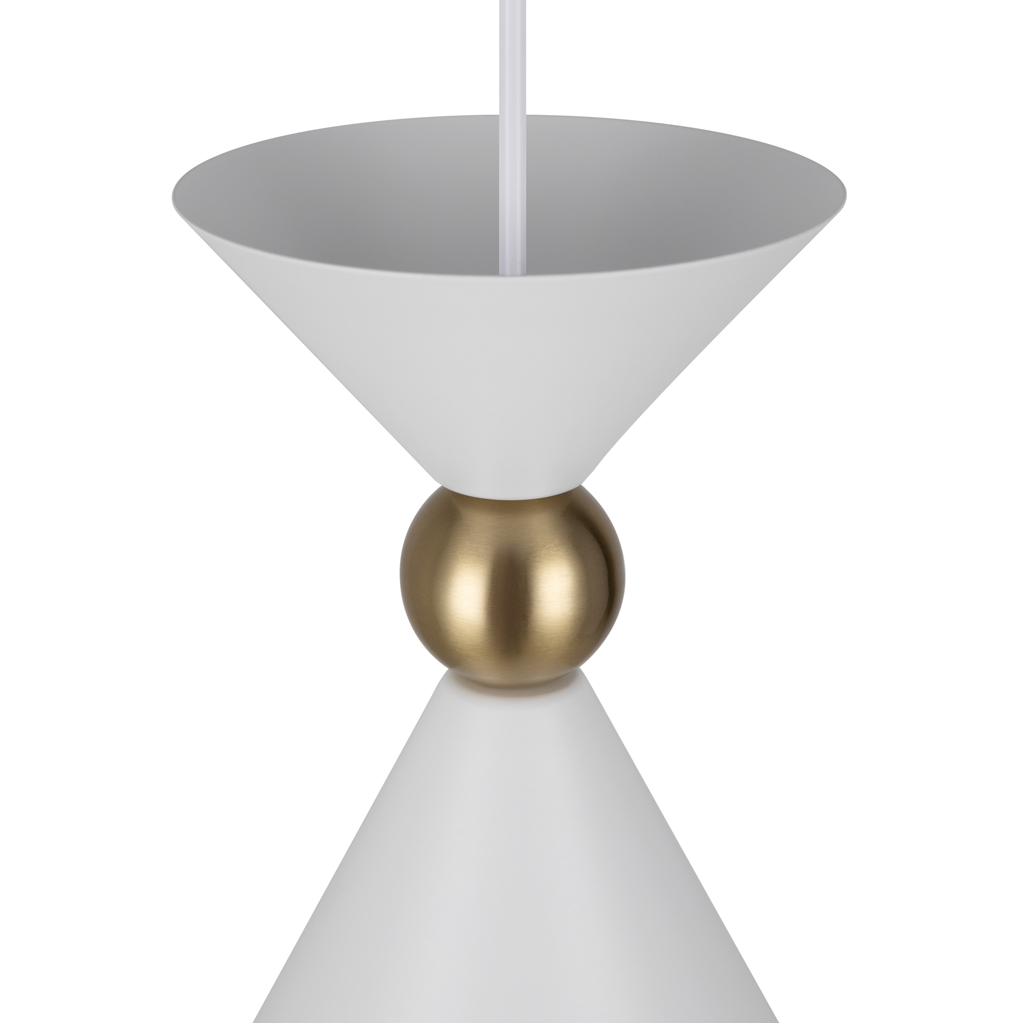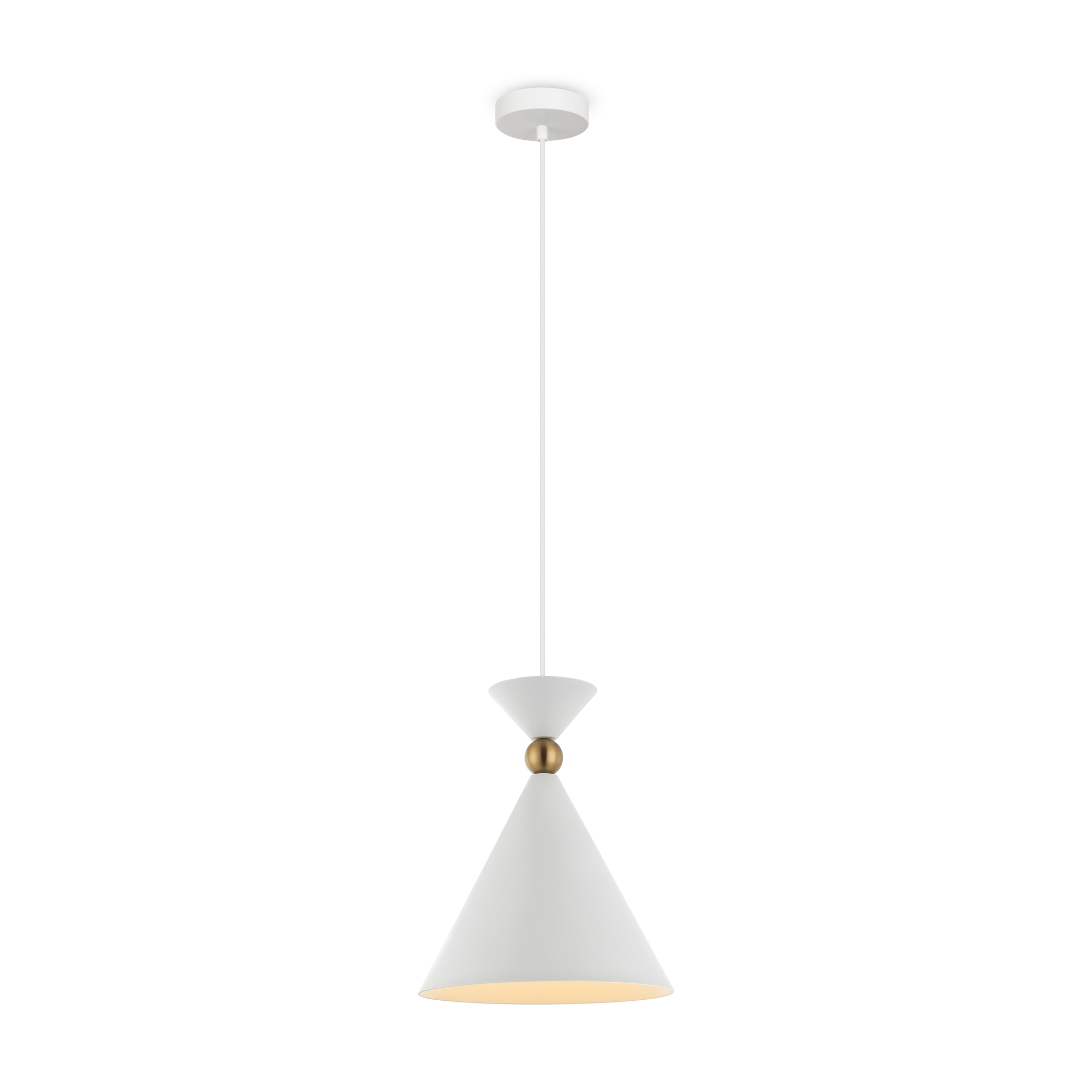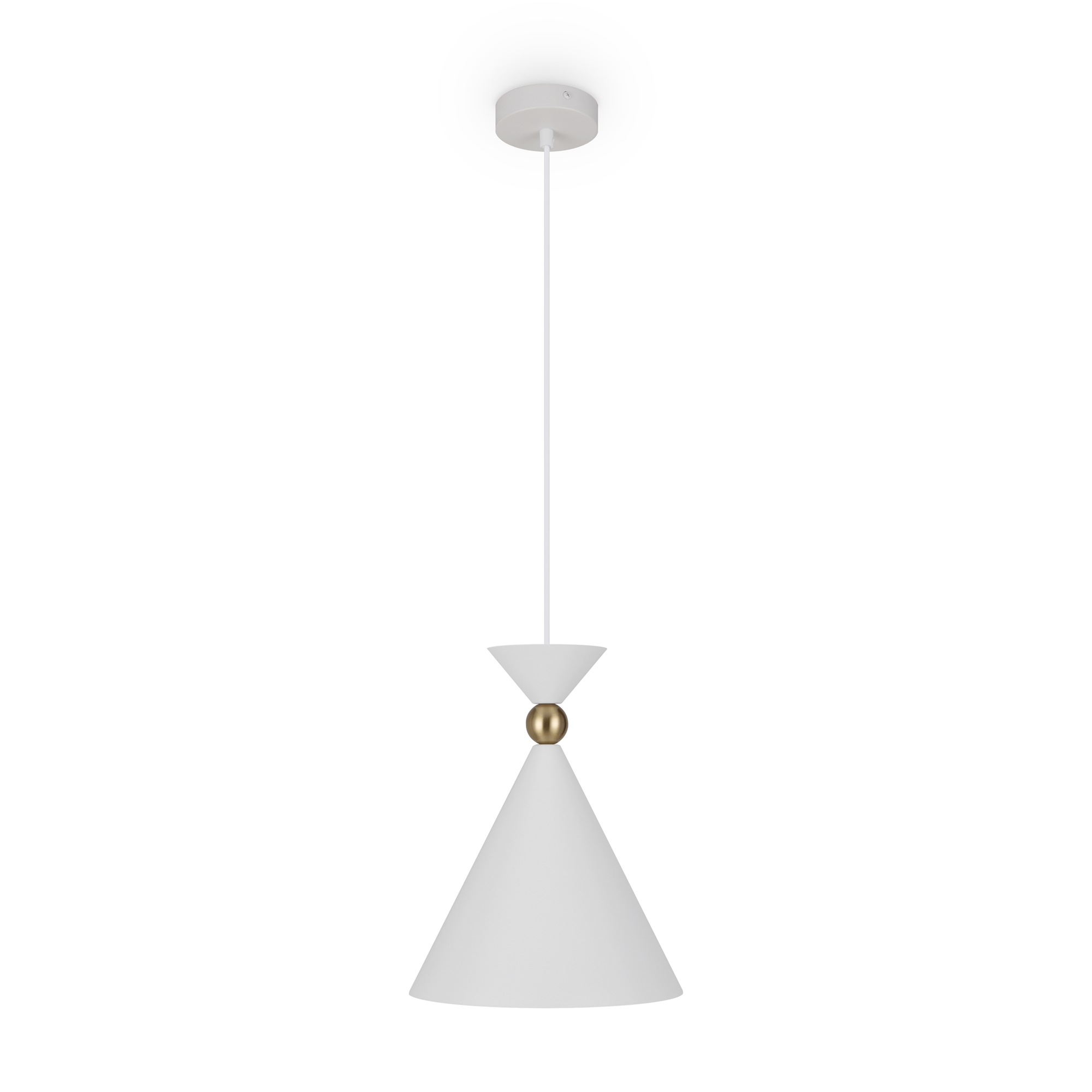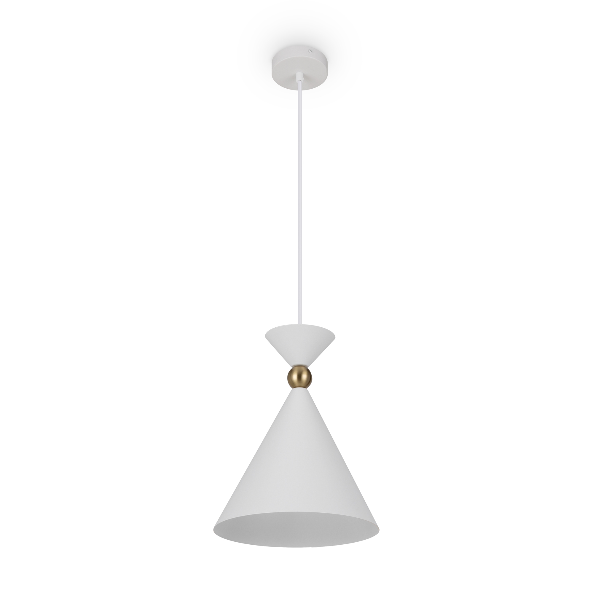 Арматура и плафоны из металла в двух цветах — белом и сером. Плафон состоит из 2-х конусов разных размеров, соединённых золотистым декоративным элементом. Высота регулируется. Идеальны для составления композиций. Источник света — лампа с цоколем Е27.