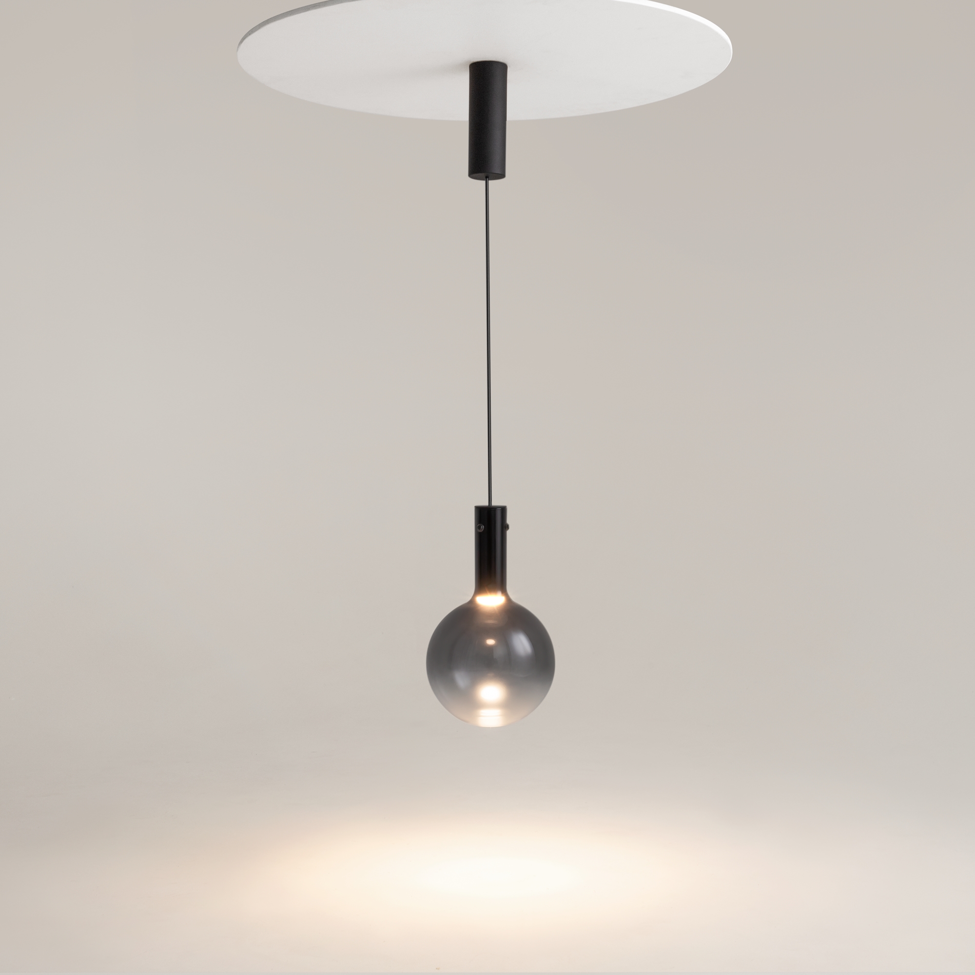 Металлическая арматура, цвет - черный, белый. Выдувной плафон-шар из стекла с вытянутым цилиндрическим основанием в трех цветах: дымчато-черный, туманно-белый, бежево-коньячный. LED-источник света в основании плафона. Цветовая температура 3000К. Два диаметра плафонов и регулируемая длина проводов для создания разнообразных композиций.
