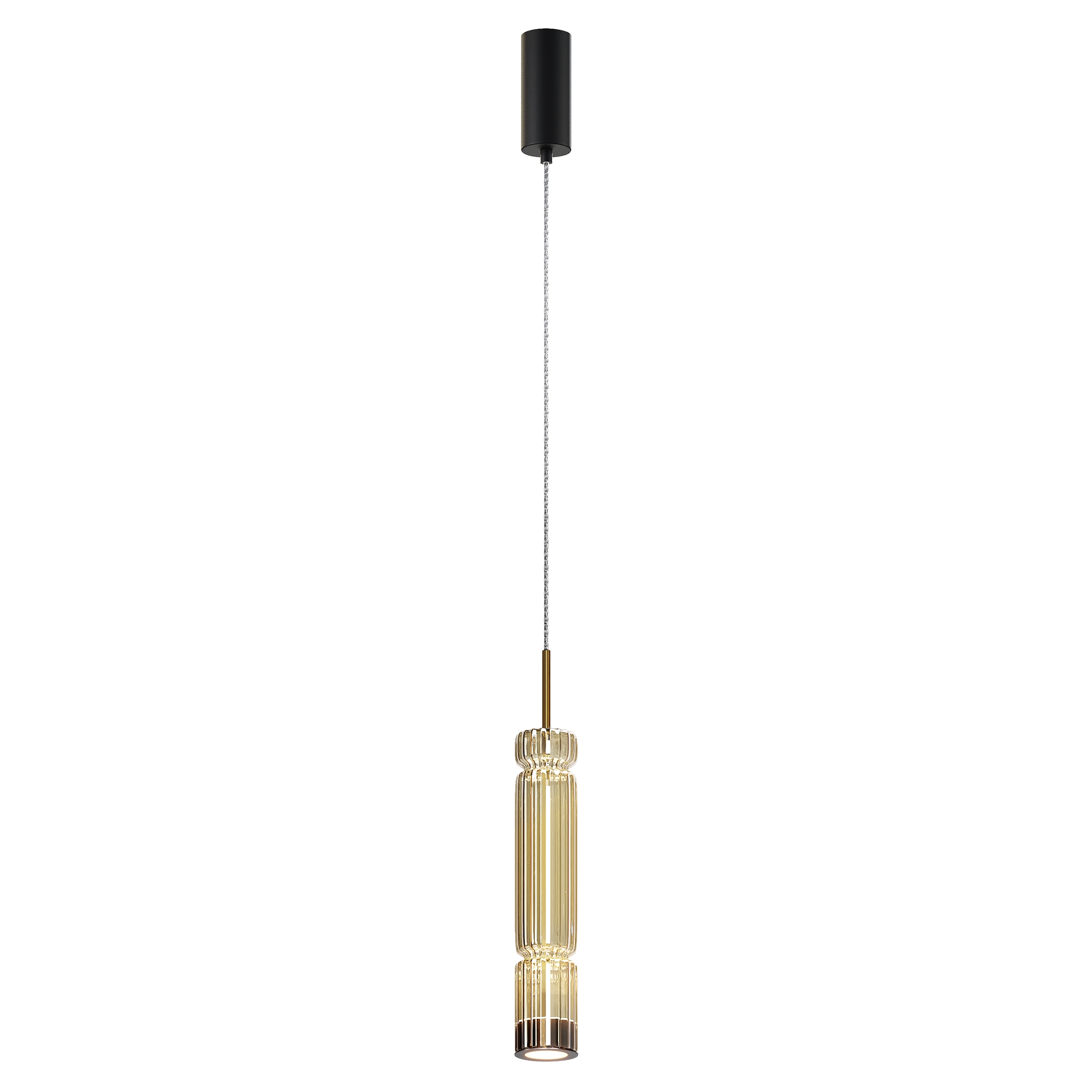 Арматура - металл, цвет - хром, латунь, черный. Цилиндрические плафоны из стекла с вертикальным рельефным рисунком в трех оттенках: прозрачный, коньячный, дымчатый. Метафора древнегреческих храмовых колонн в образе светильников. LED-источник света. Цветовая температура 3000К.