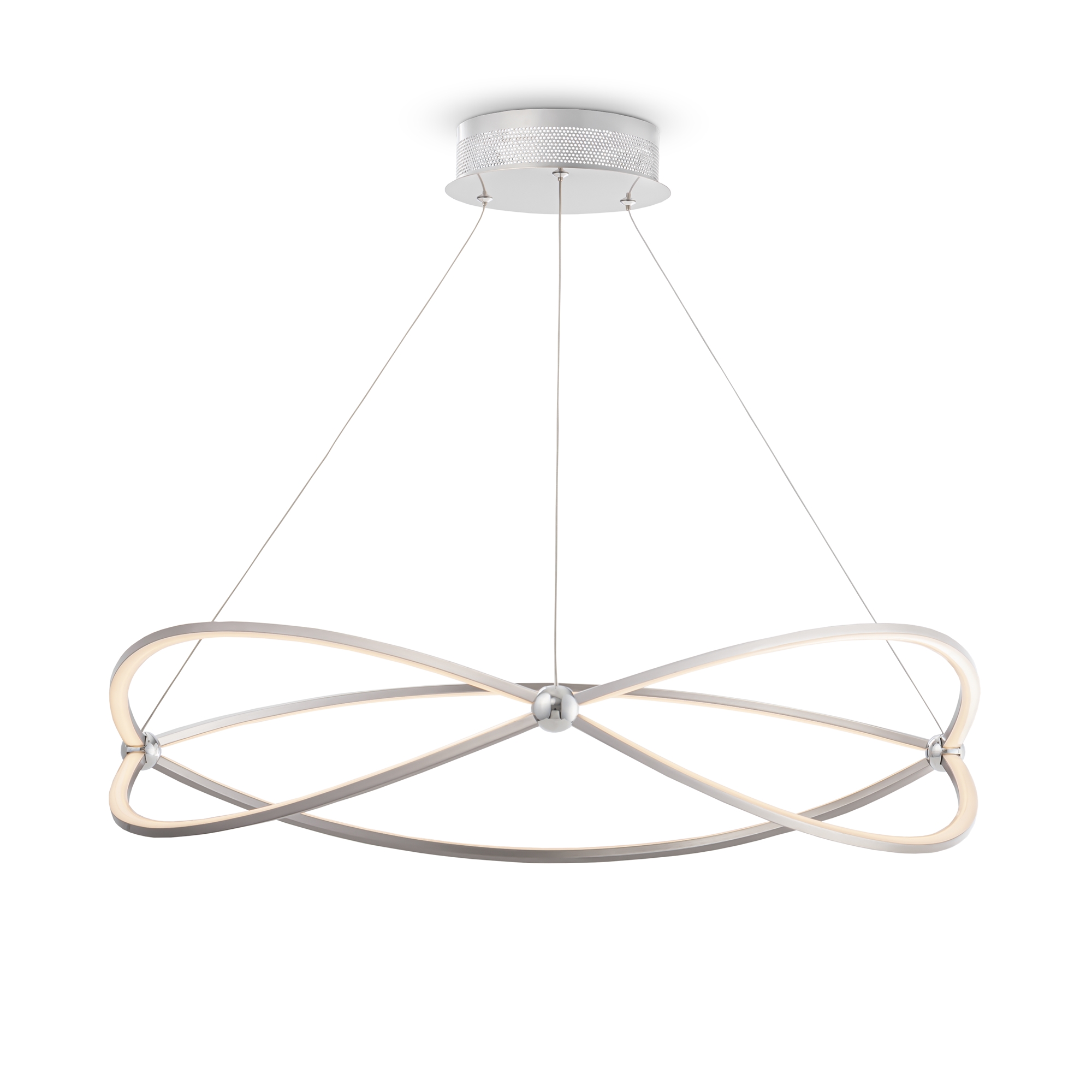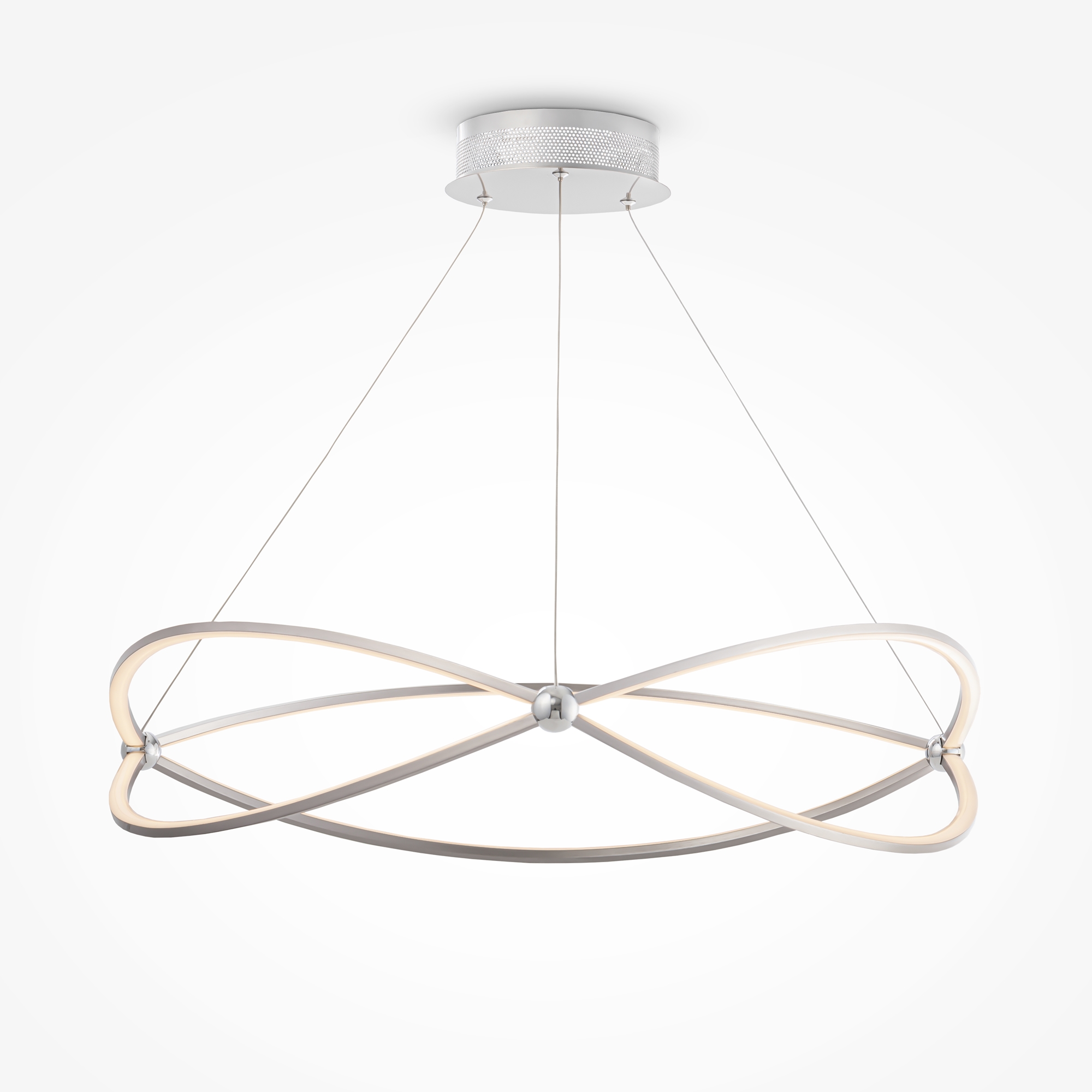 Арматура из металла, цвет – никель. Металлические кольца сжаты хромированными шарами. Двунаправленный световой поток. SMD-светодиоды скрыты под опаловым диффузором. Высота регулируется тросом.