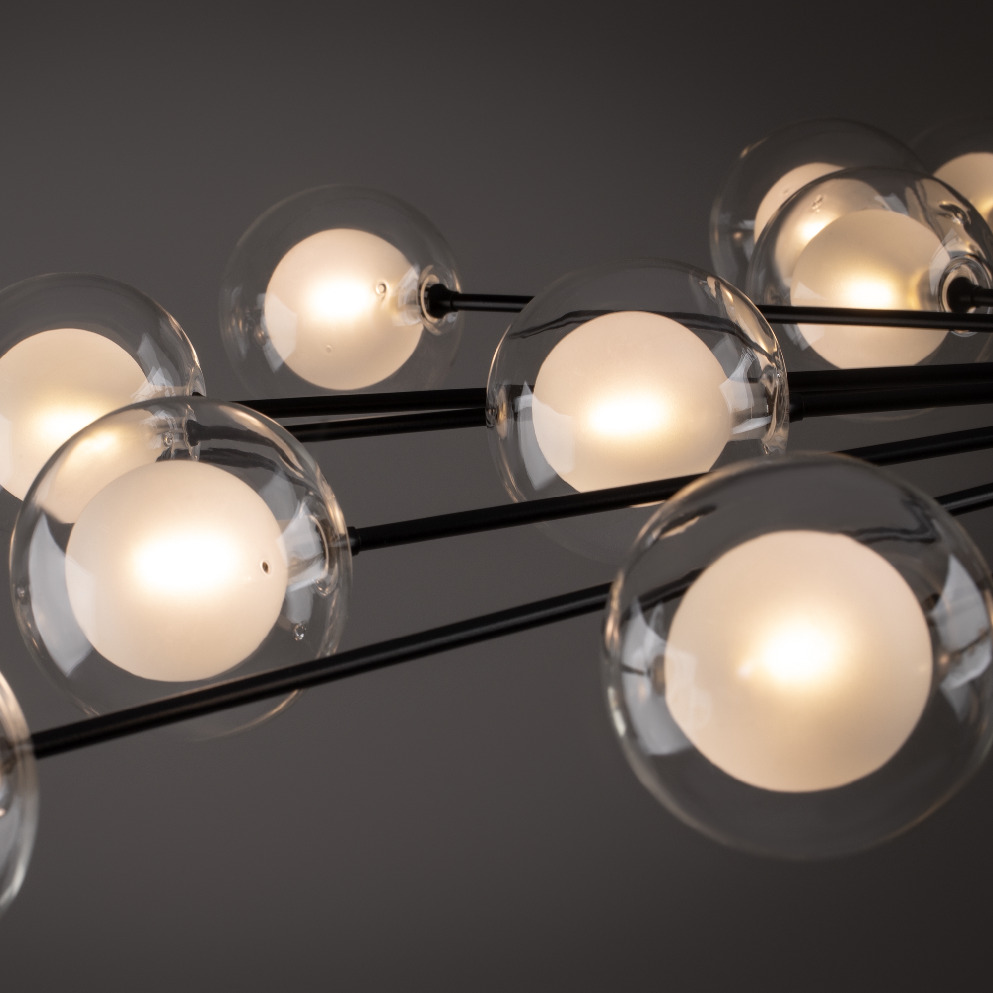 Celebrity ー это изобретательное произведение искусства. Источник света представлен двумя видами плафонов: двойное стекло и акриловое стекло в сочетании с латунной металлической окантовкой. Эти маленькие огоньки раскинуты по всей площади светильника и создают ощущение, что в вашей квартире есть свое небольшое звёздное небо. Плафоны расположены на концах арматур, которые по кругу выходят из цилиндра в центре. Материал плафонов: стекло, акрил. Цвета арматуры: черный и золото.