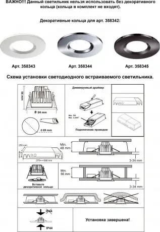 Влагозащищённый диммируемый светодиодный светильник линии REGEN идеален для использования в ванных комнатах и в других помещениях с повышенной влажностью. Он имеет класс защиты IP44.ВАЖНО!!! Данный светильник нельзя использовать без декоративного кольца (арт. 358343 – 358345). Декоративное кольцо не входит в комплект и приобретается отдельно.