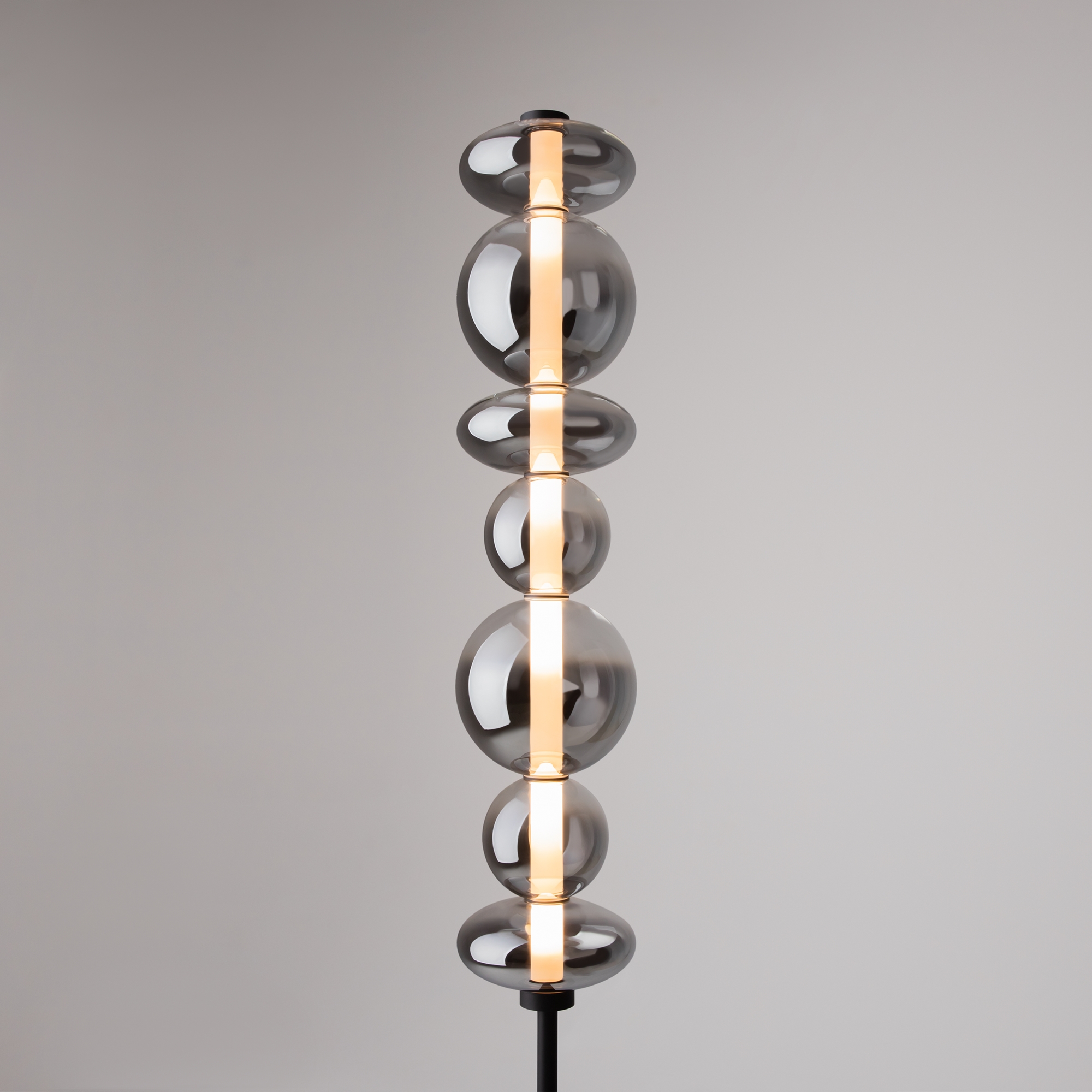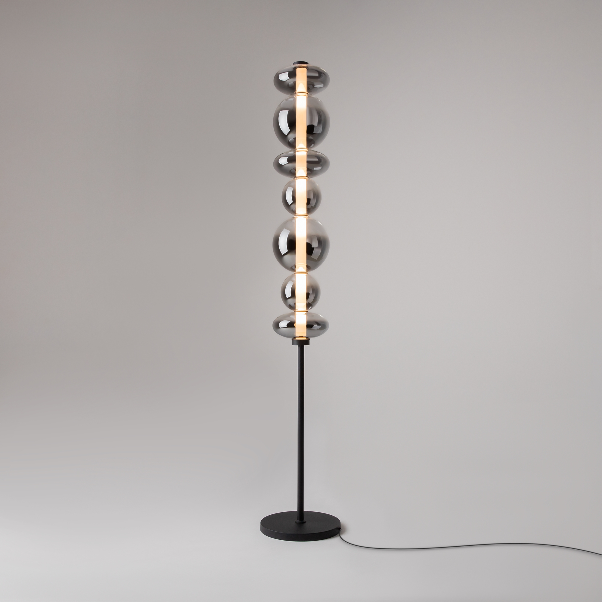 Светильники с тонированными выдувными стеклянными плафонами (дымчатыми или янтарными) и металлической арматурой (черной или цвета латуни). Окрашивание плафонов градиентное. Источник света: LED. Световой элемент установлен внутри акрилового рассеивателя. Цветовая температура источника света – 3000К, угол рассеивания — 120°. Торшеры снабжены Push-кнопкой на проводе.